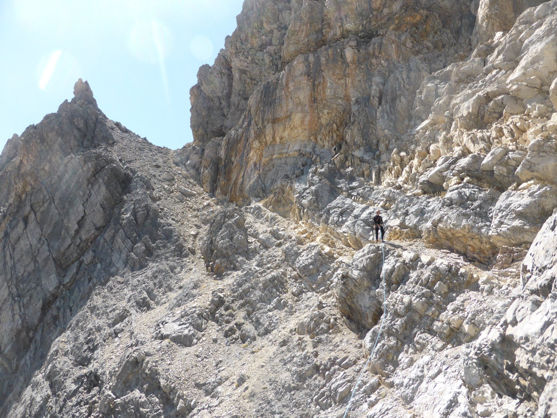 A questo punto le difficoltà si fanno più sostenute dovendo attraversare (lato italiano) una lunga serie di cenge di terra dura che tagliano la montagna.