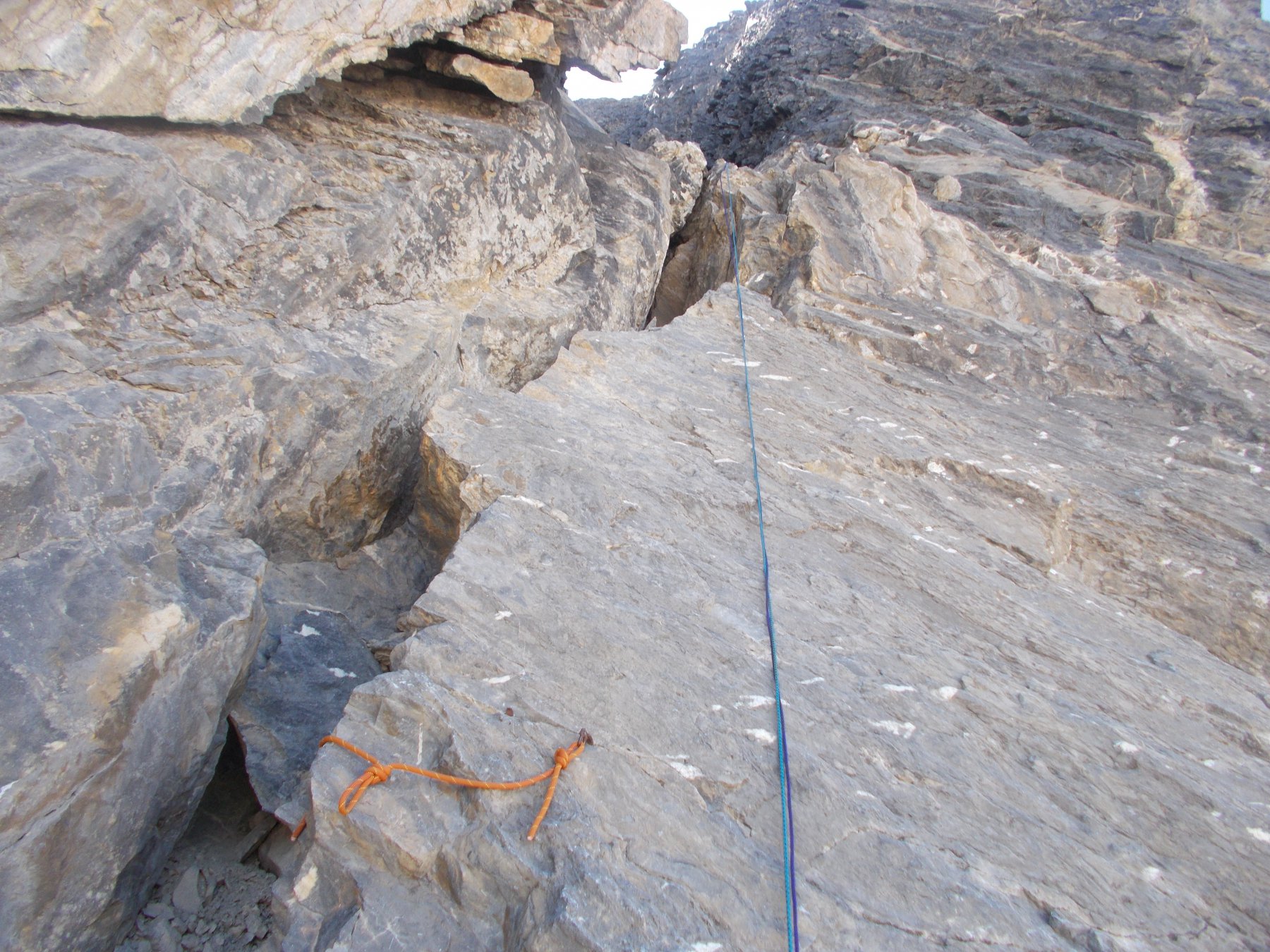 Si attraversa con un po’di cautela (lato ovest) per cenge e rocce rotte aggirando l’ultimo torrione per arrivare al pas de Jean.