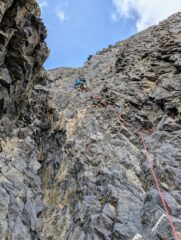 Bisogna solo tenere gli occhi aperti, noi stavamo nuovamente sbagliando (dopo il secondo chiodo con cordino) salendo troppo a destra anziché continuare sul facile a sx.