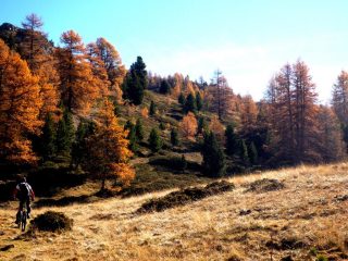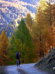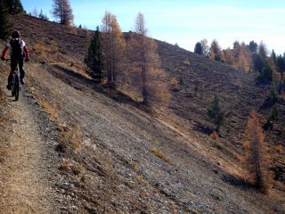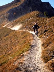La salita è abbastanza impegnativa, si sale bene fino ai Chalets ma sempre su pendenze sostenute e continue, poco sopra i Chalet fino al colle Bramousse di spinge e/o si porta la bici. Dal colle in su l’ambiente diventa spettacolare e super panoramico con ottimi scorci sul Pic de la Font Sancte. Dal Colle Bramousse fino in punta il sentiero è di una bellezza unica e si riesce a pedalare per buona parte anche se è stretto e a tratti esposto ma il fondo è buono.