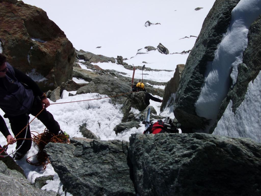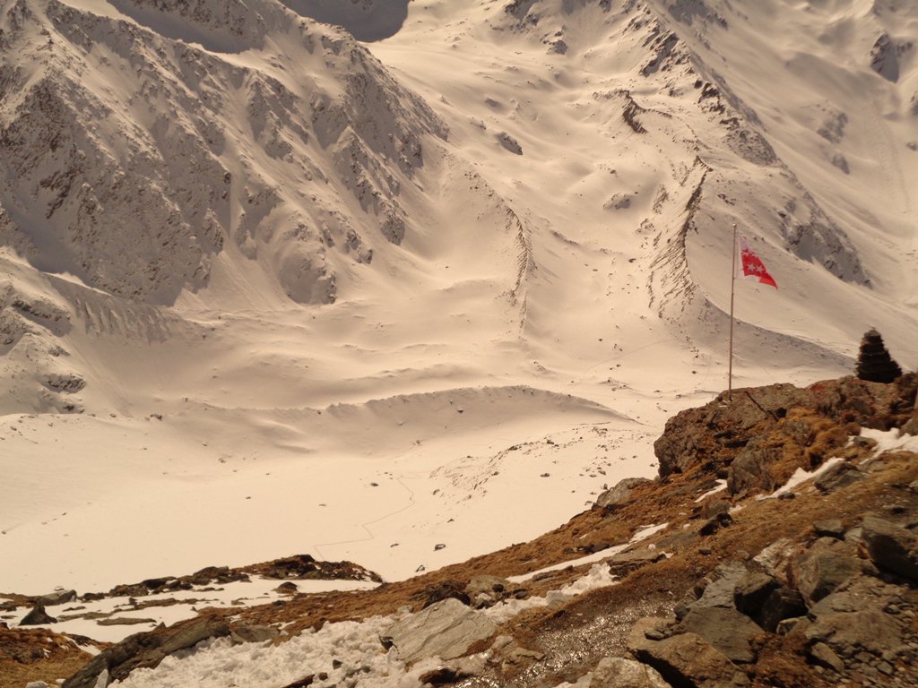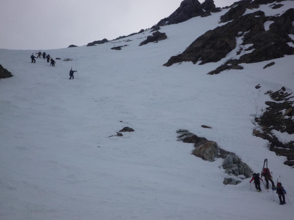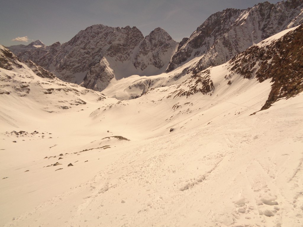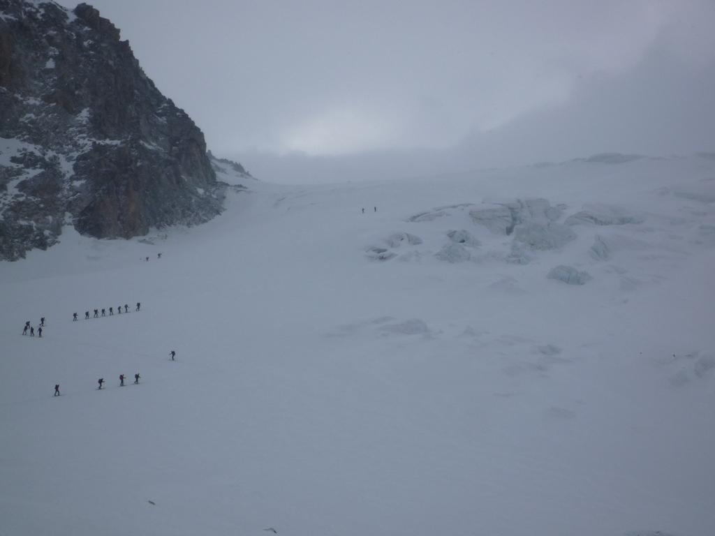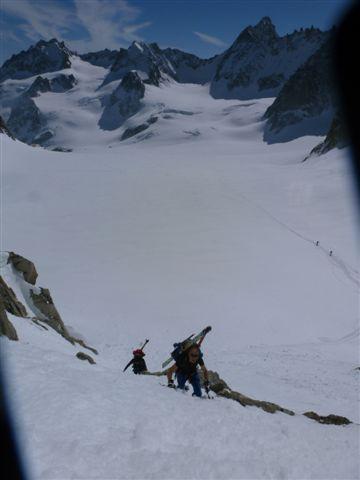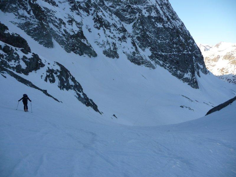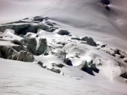 Discesa: dal colletto poco sotto la vetta ci si abbassa in una conca, quindi per un pendio più ripido verso sinistra, transitando sotto dei seracchi si perviene al Colle des Vignettes dove è situato il Rifugio mt. 3158.