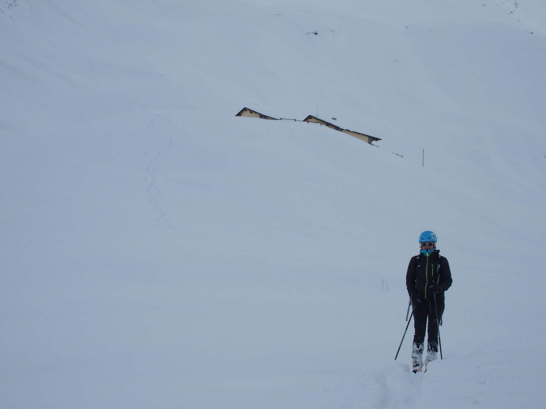 Per fortuna 3 persone ci hanno preceduto facendoci traccia quasi sino al rifugio dove ci siamo fermati , troppa neve circa 60 cm e sentito parecchi assestamenti. Pendii sopra il rifugio carichi di neve sconsigliato procedere. Discesa su tanta neve un po’ pesante e vista la poca pendenza dal rifugio sino al piano abbiamo dovuto seguire la traccia di salita. Seconda parte sempre più collosa dovuta al rialzo delle temperature. Peccato per la neve perché ambiente da 4 stelle oggi!