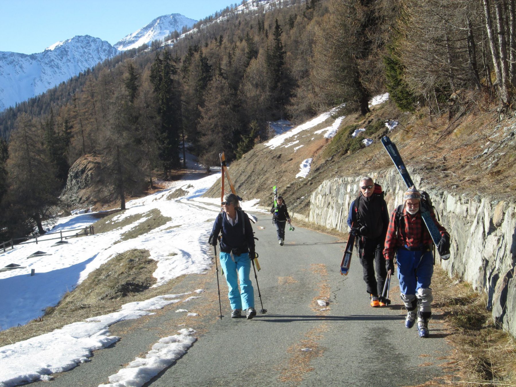 In questo periodo la quota neve in Val d’Aosta è sempre più elevata. In auto siamo saliti fino a quota 1980 metri, più in avanti vi erano tratti ghiacciati pericolosi per auto normali. Abbiamo portato gli sci a spalle lungo la strada fino a circa 2100 metri. Le tre stelle evidenziate in questa gita sono abbastanza elevate, direi che dovrebbero essere 2,5 stelle in quanto solo il tratto in basso era abbastanza sciabile. Oggi in compagnia di dieci “evergreen” che saluto calorosamente