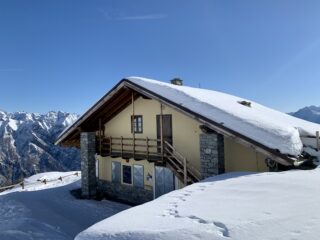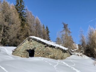 Si parte dalla sbarra su strada battuta dalle motoslitte. Volendo la strada si taglia più volte, anche in discesa tenendosi, scendendo, verso destra, dove le zone in ombra garantiscono una copertura maggiore. Ci vuole attenzione, ma si passa. Da quota 1900 copertura importante, da 50 cm, sino agli 80 dei pendii superiori, molto belli e divertenti da sciare su neve incoerente.