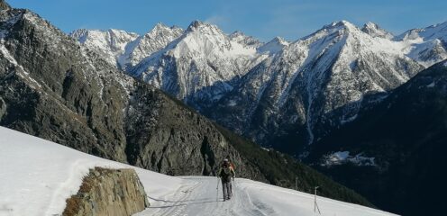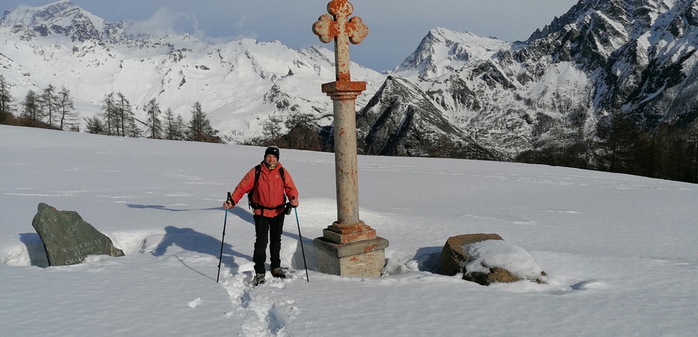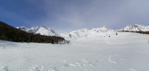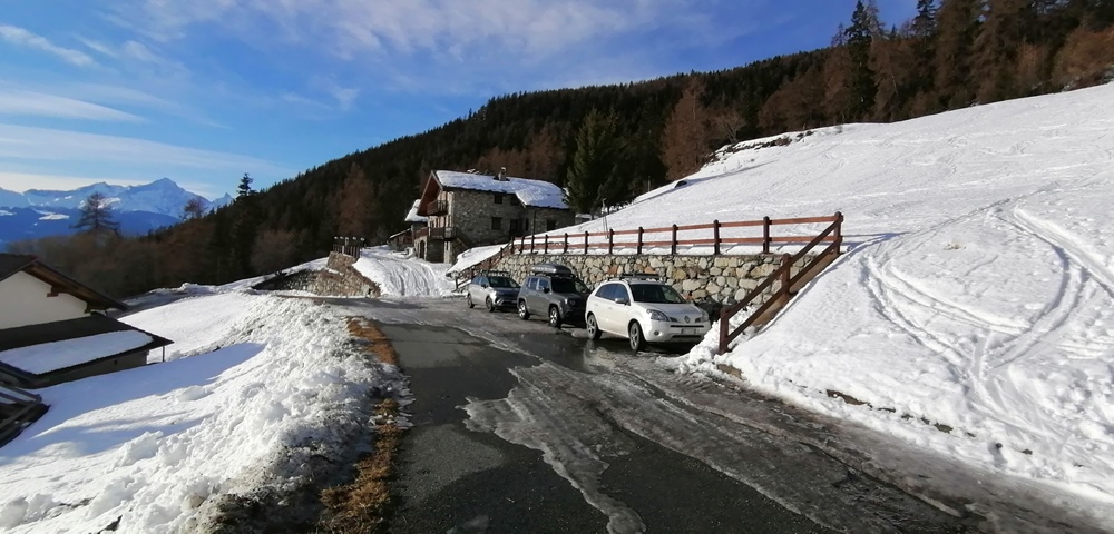 Meteo impazzito. Alle 9.00 salendo in Valpelline 18°! Siamo partiti da un gruppo di case fin dove era pulita la strada. Poi siamo saliti lungo la strada mettendo le ciaspole. Arrivati a Plan Debat verso le 12.00 dopo due ore di salita. Vista l’ora tarda e la neve molliccia che non invitava a salire abbiamo deciso di fermarci. Si alzava anche il vento. Scesi all’auto tagliando per prati.