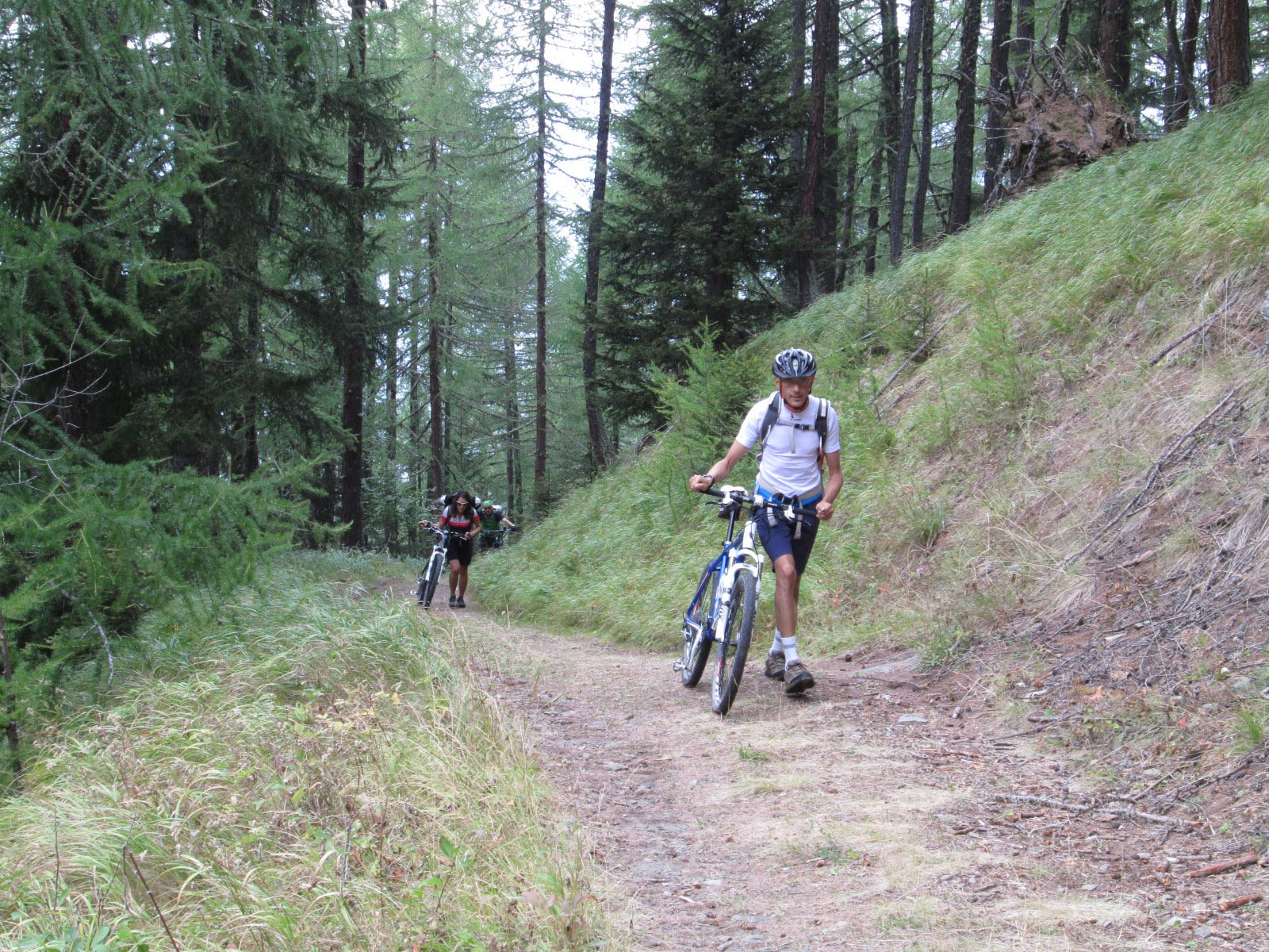 Gita sociale CAI Pianezza con 12 partecipanti. Per abbreviare un po’ la salita siamo partiti dalla frazione Buillet, da dove si lascia immediatamente la strada principale. Prima parte di salita molto agevole, splendido il traverso nel bosco che porta a Rhemes Saint-Georges. Da qui comincia la salita vera…i primi Km fino a Champromenty presentano pendenze costanti e mai troppo impegnative, poi la musica cambia e i primi 2 Km dopo la frazione sono terribili, con una pendenza media del 15%…per fortuna ogni tanto c’è qualche breve tratto in cui spiana leggermente, ma ci sono delle rampe durissime, ben oltre il 20%. Il fondo è comunque buono e io sono riuscito a farla tutta in sella, sia pure con parecchie pause per prendere fiato…negli ultimi 700-800 metri prima del colle spiana di nuovo, e quindi la parte finale è decisamente più agevole. Dal colle abbiamo rinunciato a salire anche al Monte Paillasse, accontentandoci della vicinissima vetta del Petit Mont Blanc (5 minuti a piedi dal colle), peccato però che le nubi non ci abbiano permesso di ammirare lo splendido panorama.