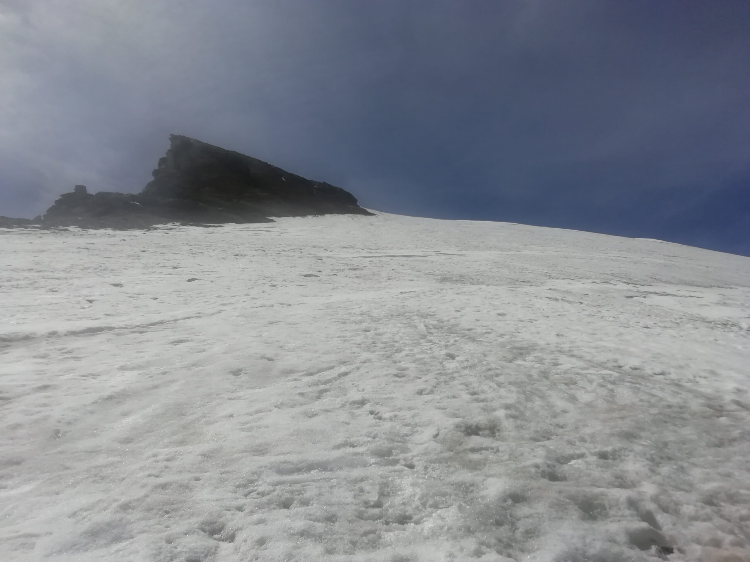 Ramponi calzati da quota 2740 circa. Neve inizialmente buona portate fino al canalino che ormai non si presenta più percorribile integralmente. Io personalmente ne ho percorso un pezzetto e dopo mi sono sposato a dx su rocce delicate ma non marcissime (II max) per sbucare dove ci sono due ometti a quota 3060. Da qui fino a 3200 percorso pulito da neve, dopo la neve si presenta davvero marcia, si sprofonda fino all’inguine per mancanza di rigelo, ma almeno adesso c’è una traccia. Da quando ho visto ghiaccio affiorante ho deciso di deviare decisamente a sx per salirci sopra e continuare da lì evitando sprofondamenti. Crepacci ancora abbastanza chiusi, bisogna solo fare attenzione in alcuni punti ci sono strisce di neve dove c’è ne sono sotto. Ultimo pezzo su ghiaccio puro, terminale non ancora aperta. Seconda picca consigliabile per questo pezzo.