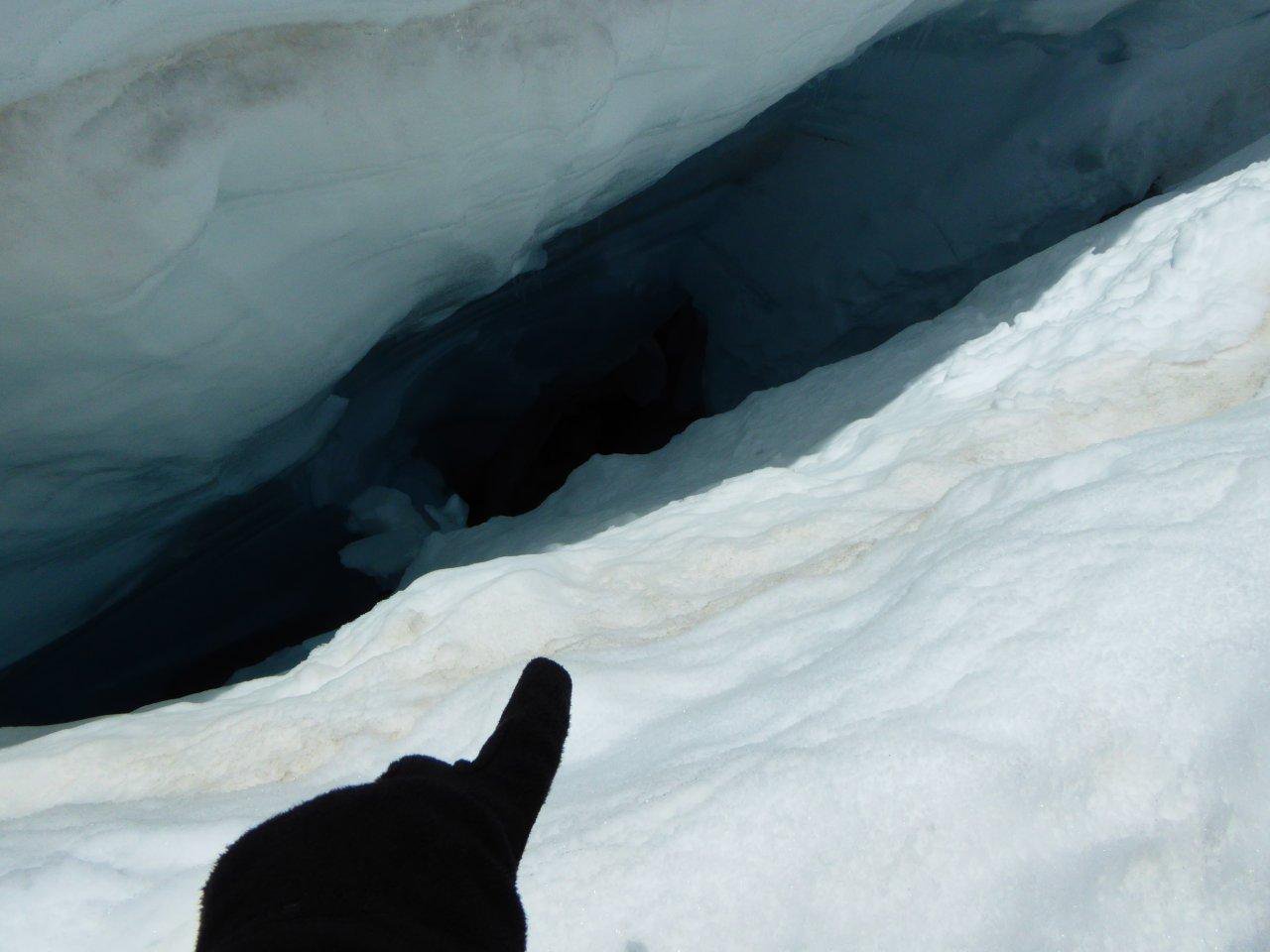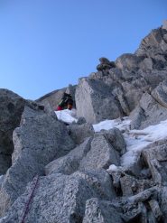 Discesa verso NW fino ad una selletta, si scende il couloir di neve e poi a dx per una terrazza nevosa. Li con una doppia si arriva in fondo al couloir. Eventualmente c’è la possibilità di farne una seconda.