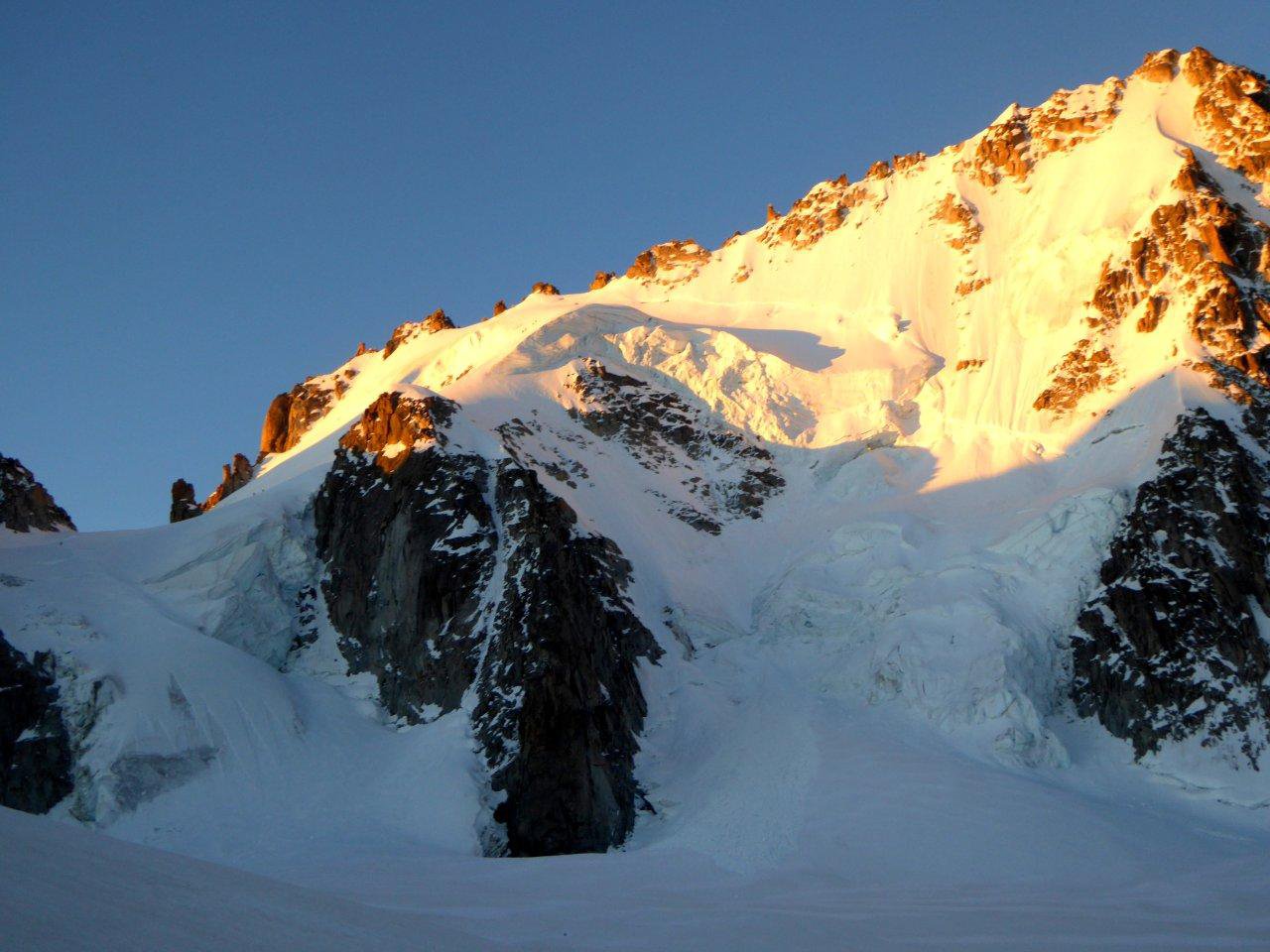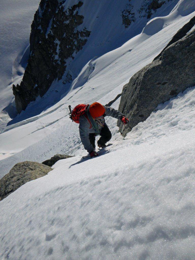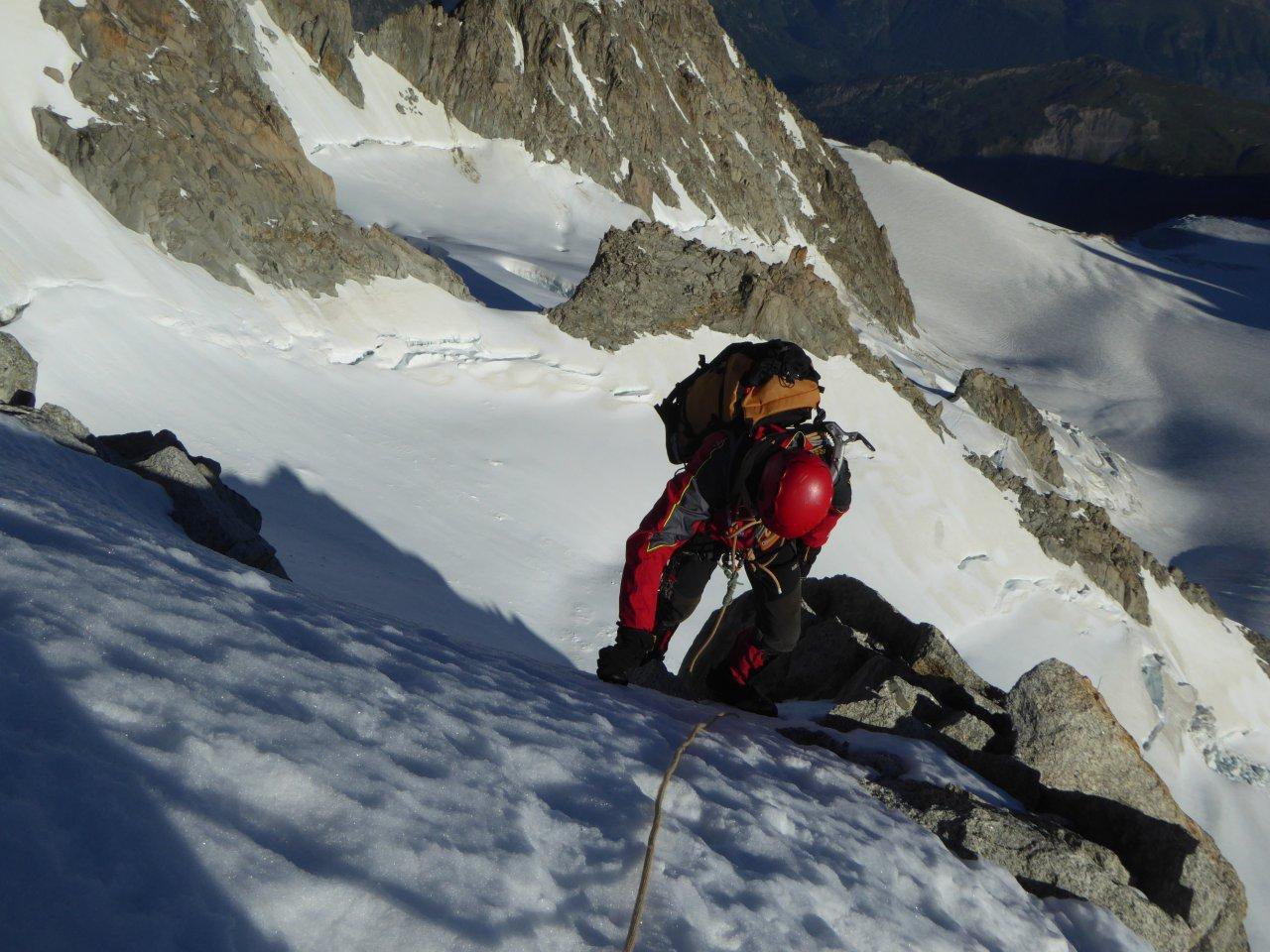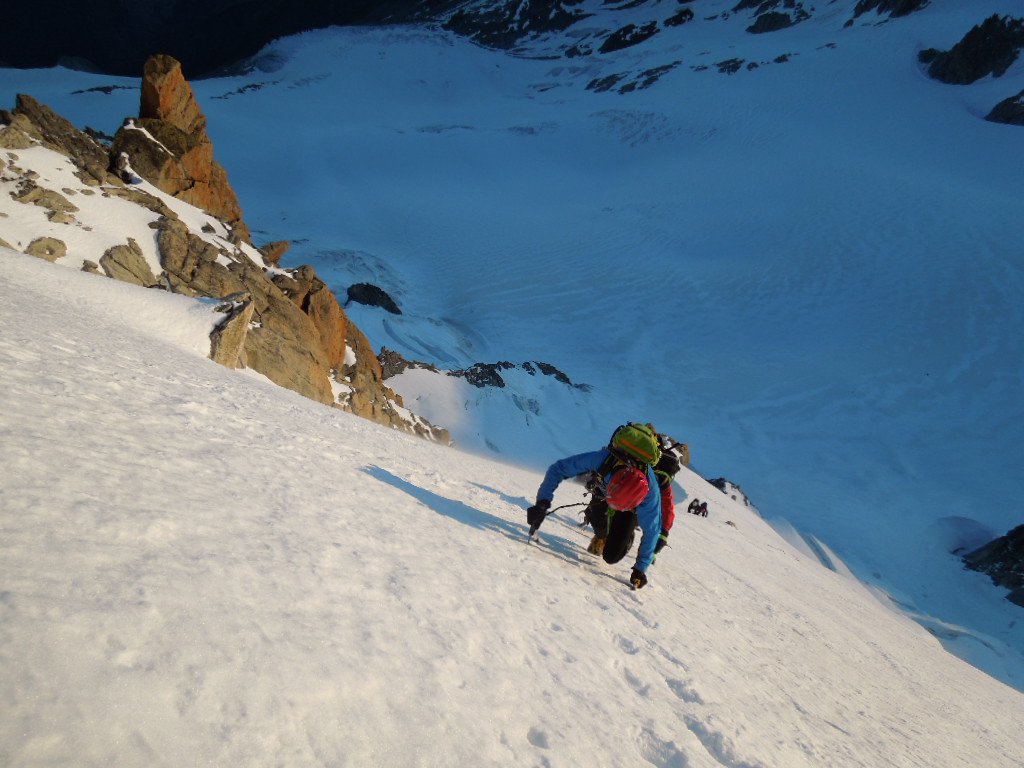 Partenza dal Refuge Albert I, proseguiti per il Col du Tour e l’isolotto roccioso fino allìattacco dell’evidente sperone (1h30), Più rapido tagliare il ghiacciaio, si risparmiano 30 minuti.