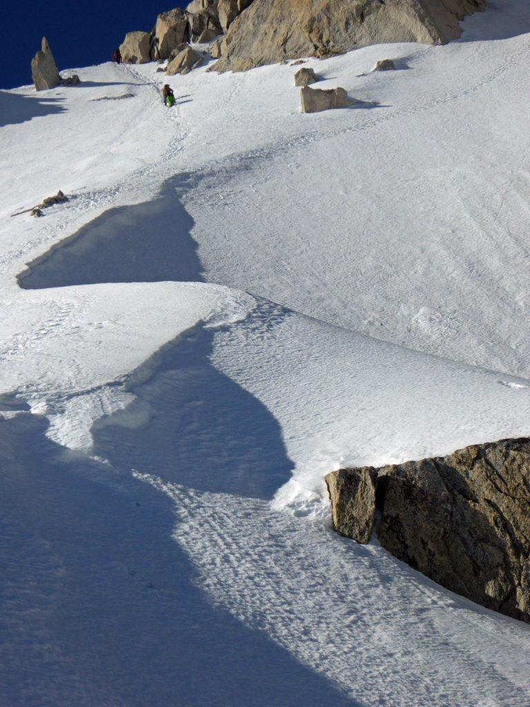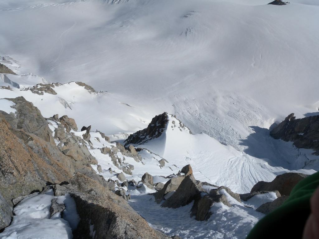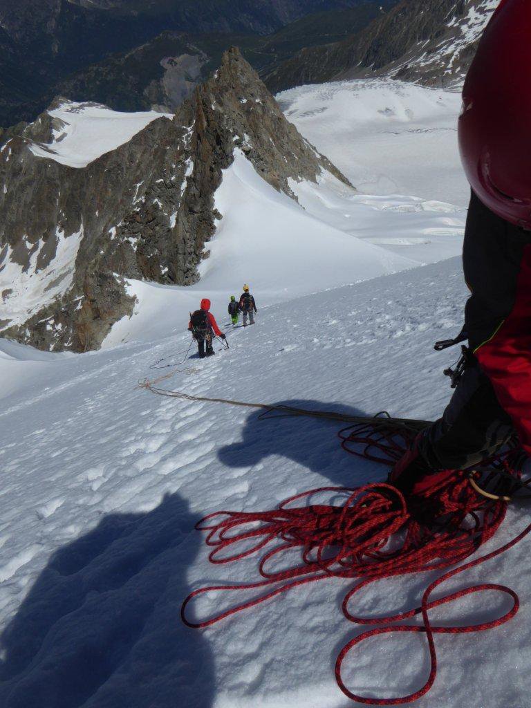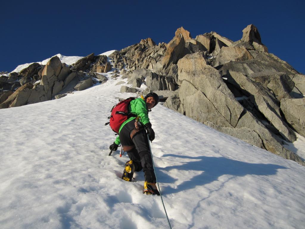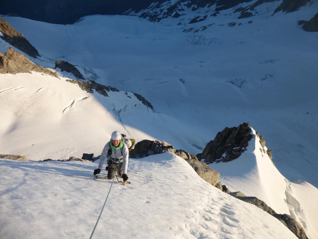 Partenza dal Refuge Albert I, proseguiti per il Col du Tour e l’isolotto roccioso fino allìattacco dell’evidente sperone (1h30), Più rapido tagliare il ghiacciaio, si risparmiano 30 minuti.