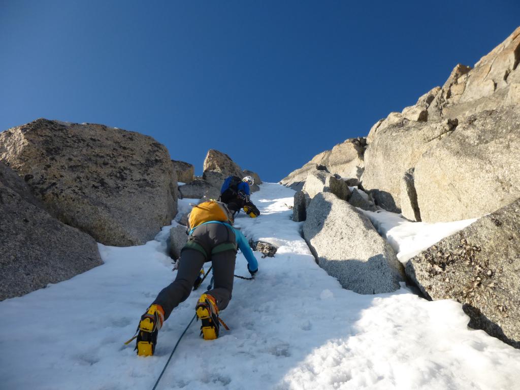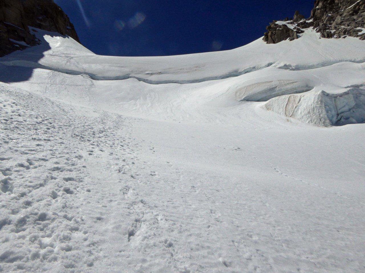 Si sale per facili pendii fino a mettersi a riparo dai seracchi di sx sotto un roccione, quindi prendere la goulotte (30m) a 60-65° e poi misto passando a sx di uno sperone rosso, quindi su neve fino in cima.