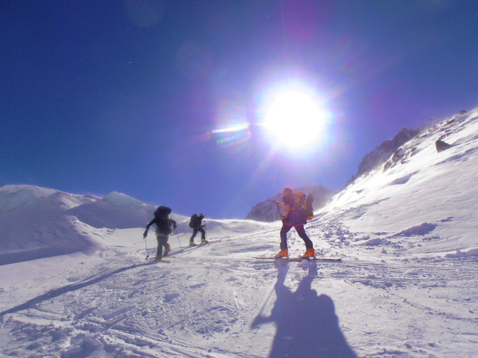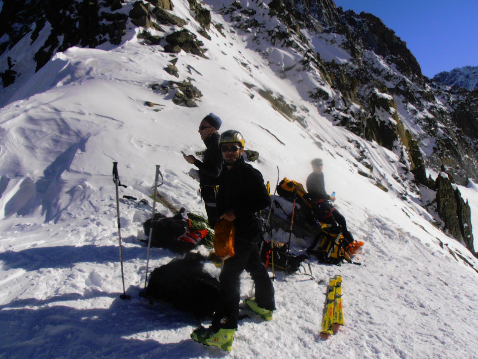 oggi nel male (dopo la terza benna all’aiguille du midi chiusa x vento atteso fino alle 9)e andata benissimo , optiamo x questa salita dal l’intermedio (lognan)(13.20 euro)solo che tra un tira molla si fanno le 11. in 4 ore circa arriviamo al colle , premetto che visto l’ora di risalita i pendii erano tutti bei morbidi quindi si saliva bene sulla traccia che altri in un paio d’ore prima anno tribolato,anzi faceva già zoccolo ,e noi abbiam patito sicuramente lo sballottamento di programma e l’ora tarda x il sole che ci ha cotto x bene , insomma che la meta e stata raggiunta con un ottimo lavoro di squadra.(ottimo panorama sulla svizzera e zona tutto intorno alle più famose nord in ghiaccio difficili e (nere). discesa su crosta molle fino al ghiacciaio sottostante x poi ridiscendere su traccione schiacciato liscio fino alle piste x farsi due curve tranquilli fino al paese. saluti ai soci Omar,Dario,Ivo.e contraccambio un saluto ai due ragazzi conosciuti all’autogrill prima d’aosta con la nostra stessa idea di meta,in cui loro son riusciti a fare x(bricola)e noi abbiam guardato dai vetri visto che an chiuso la funivia.e caso vuole che noi stessi ci incontriamo di nuovo fianco fianco all’ingresso del tunnel alle 18(cosi la domanda, cosa avete fatto? le periades.)sig!!!!CIAO A TUTTI.