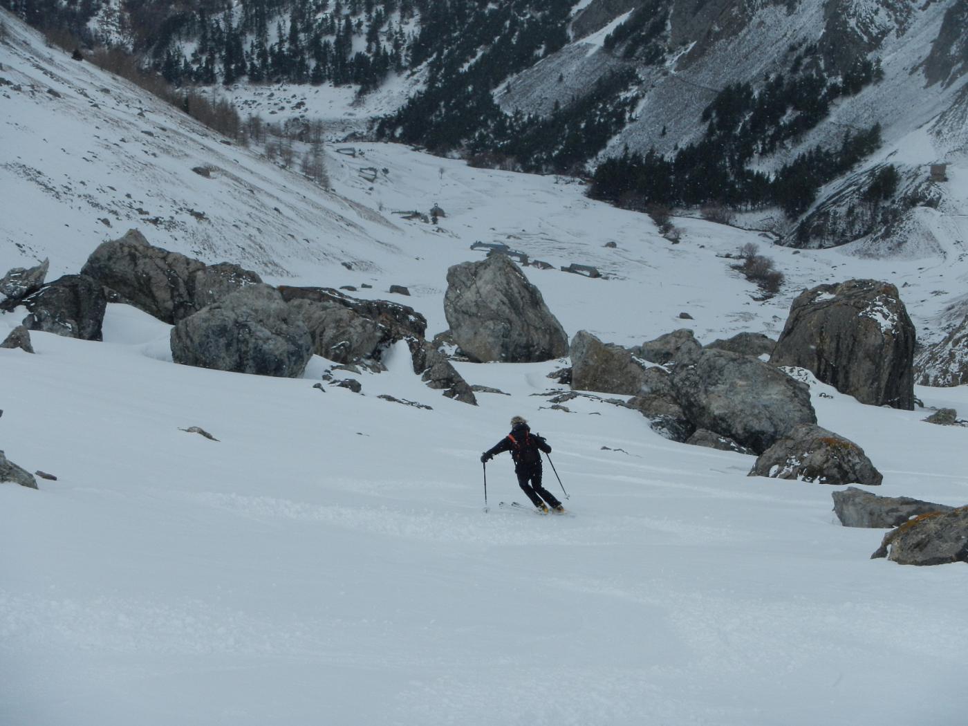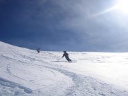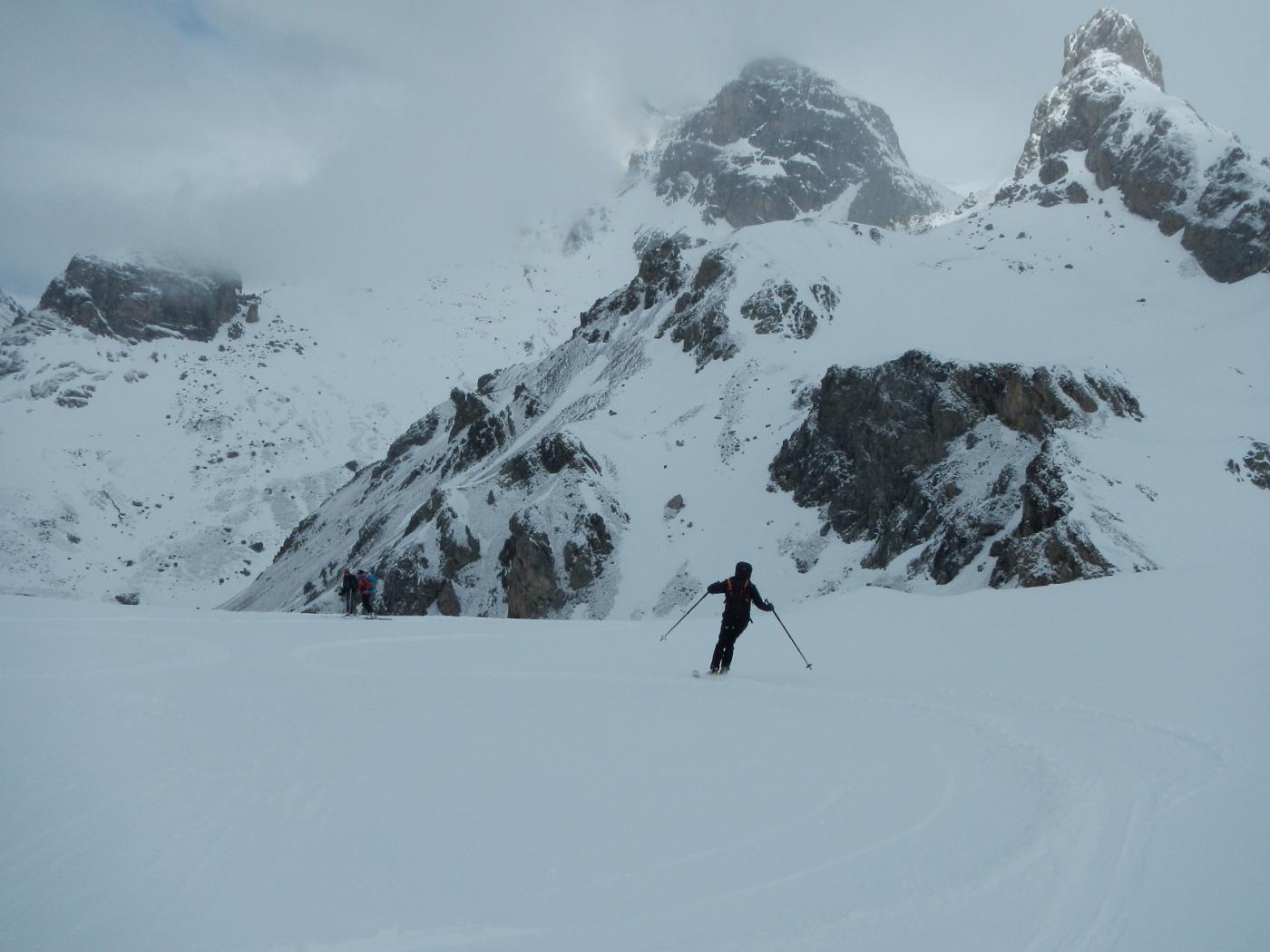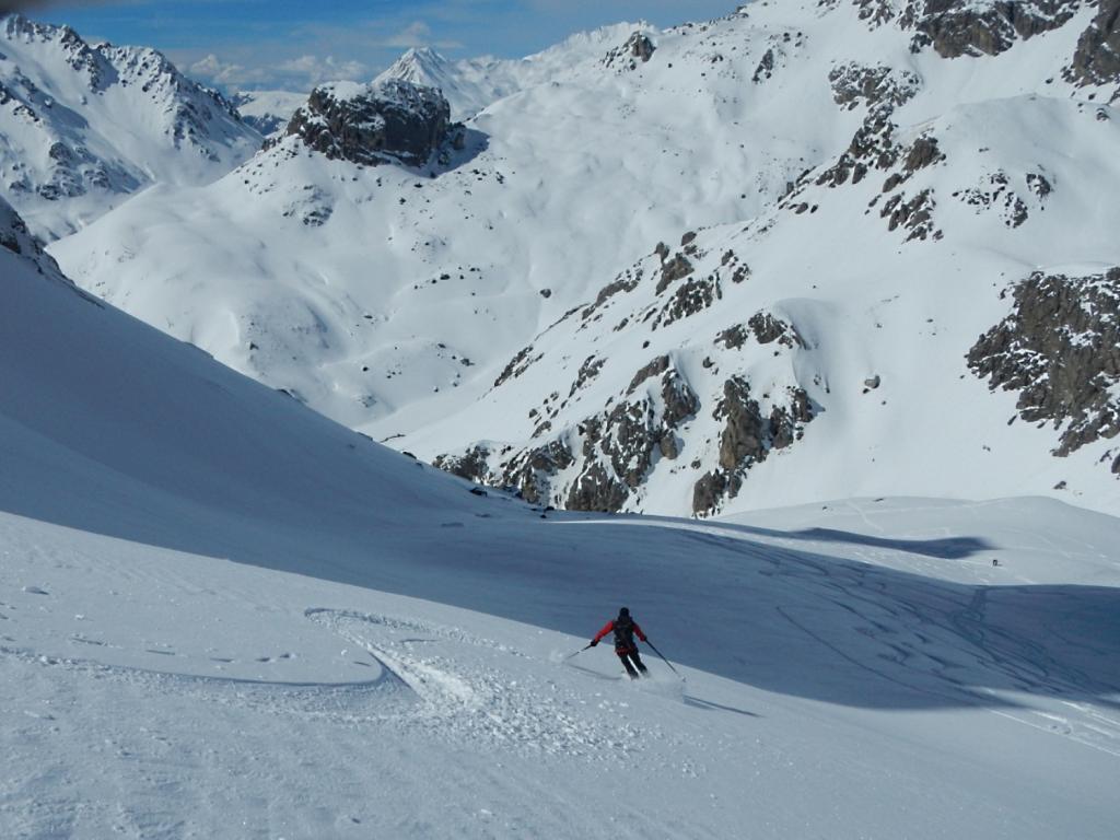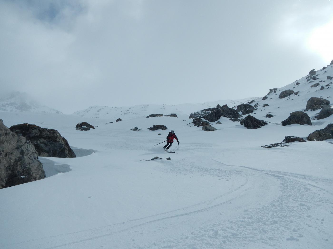 La discesa è per la via di salita (BS), o per uno dei pendii/canale tra la cima e il colle Chardonnet (OS/200m 30°/35°) ricongiungendosi al piano quota 2209m e da li rientro per la via di salita.