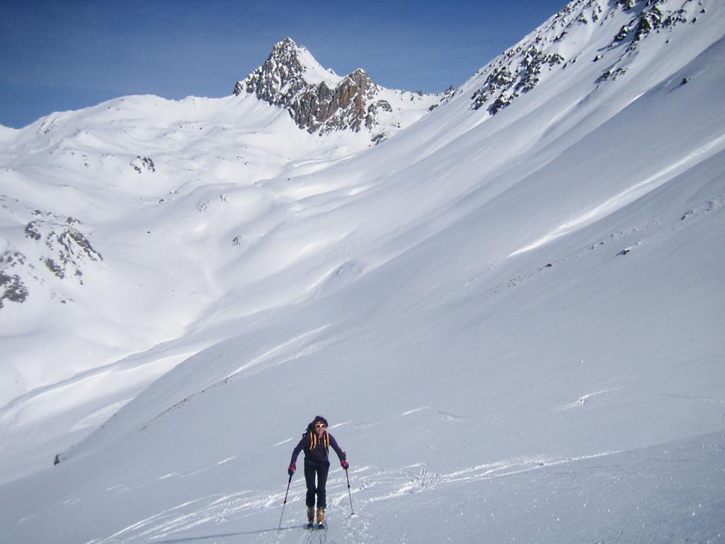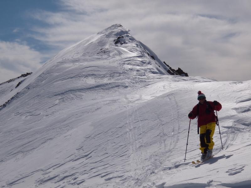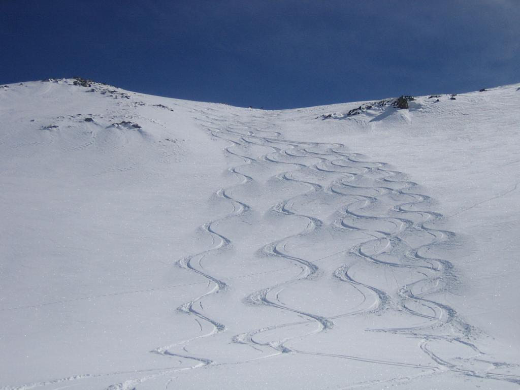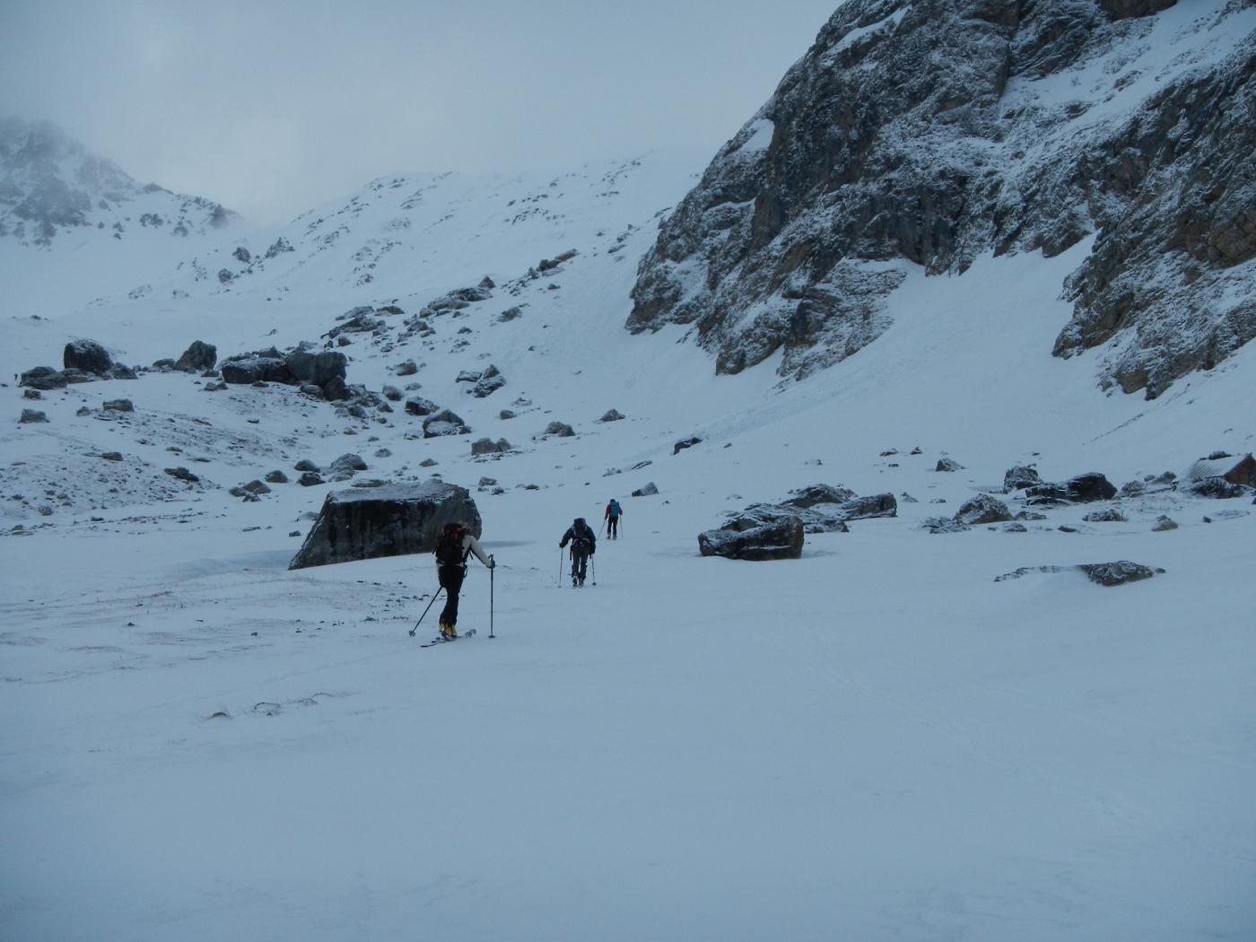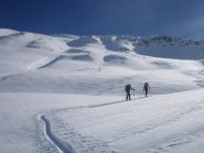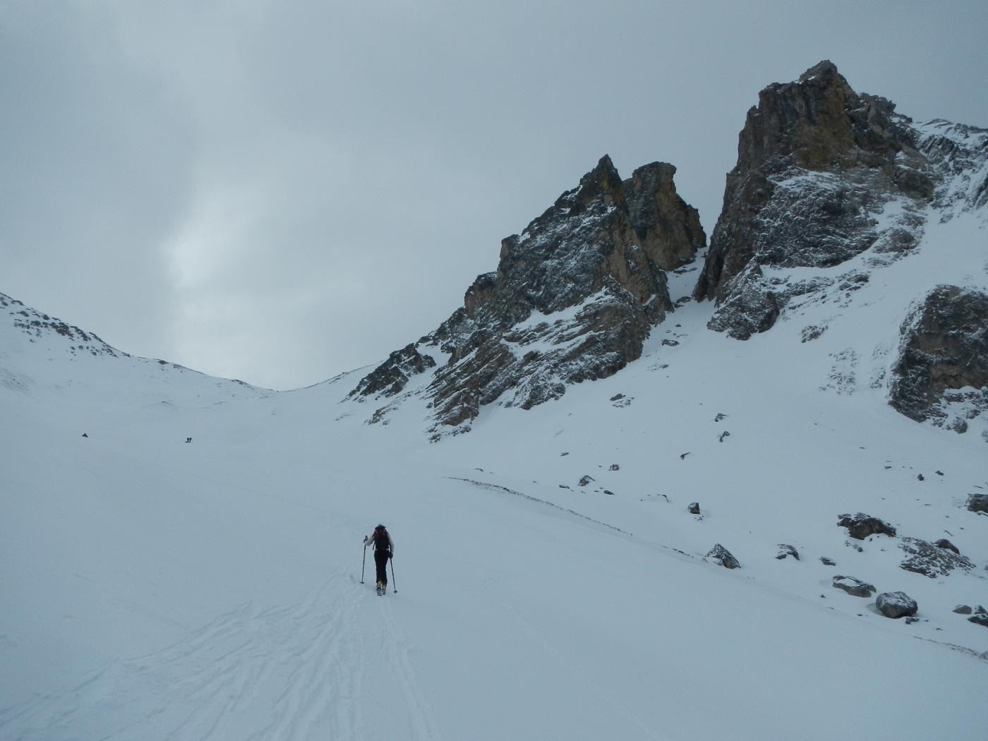 La discesa è per la via di salita (BS), o per uno dei pendii/canale tra la cima e il colle Chardonnet (OS/200m 30°/35°) ricongiungendosi al piano quota 2209m e da li rientro per la via di salita.
