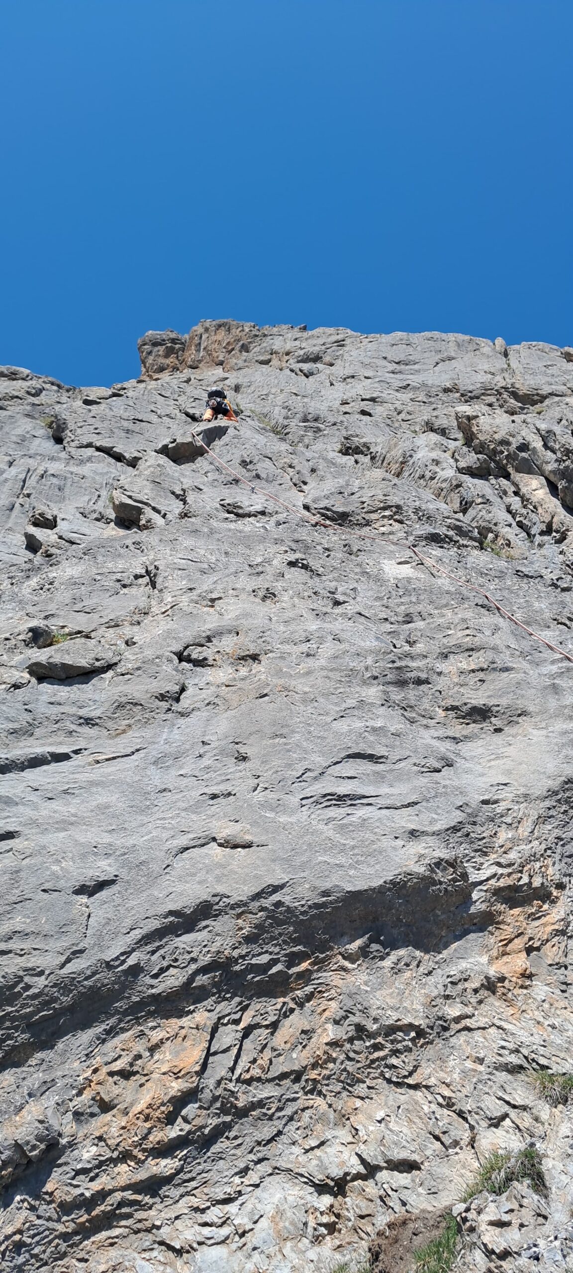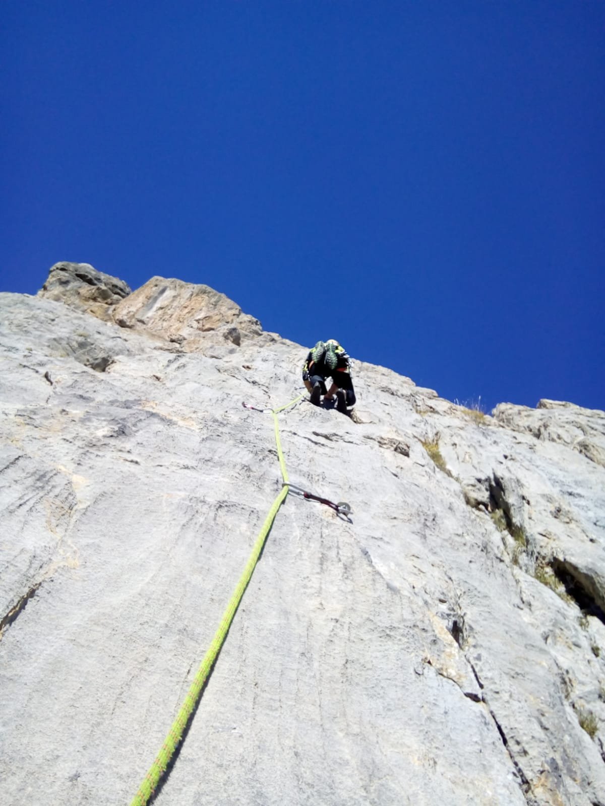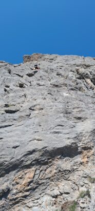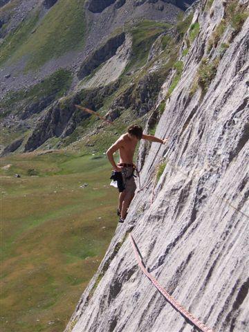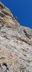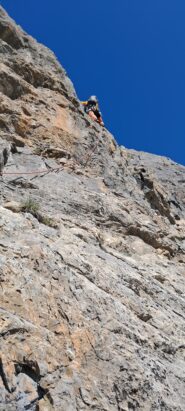 nota: questi due tiri disomogenei con il resto della via possono essere evitati proseguendo in salita la cengia fino all’attacco del III tiro (spit con cordone bianco)