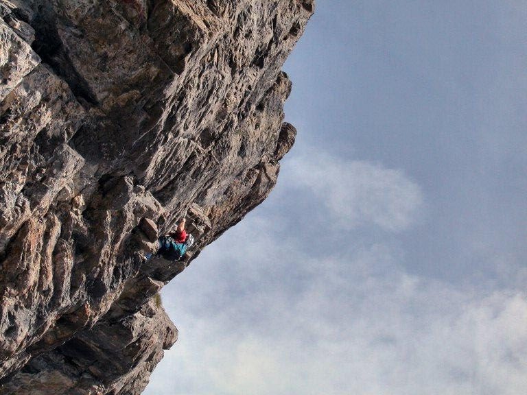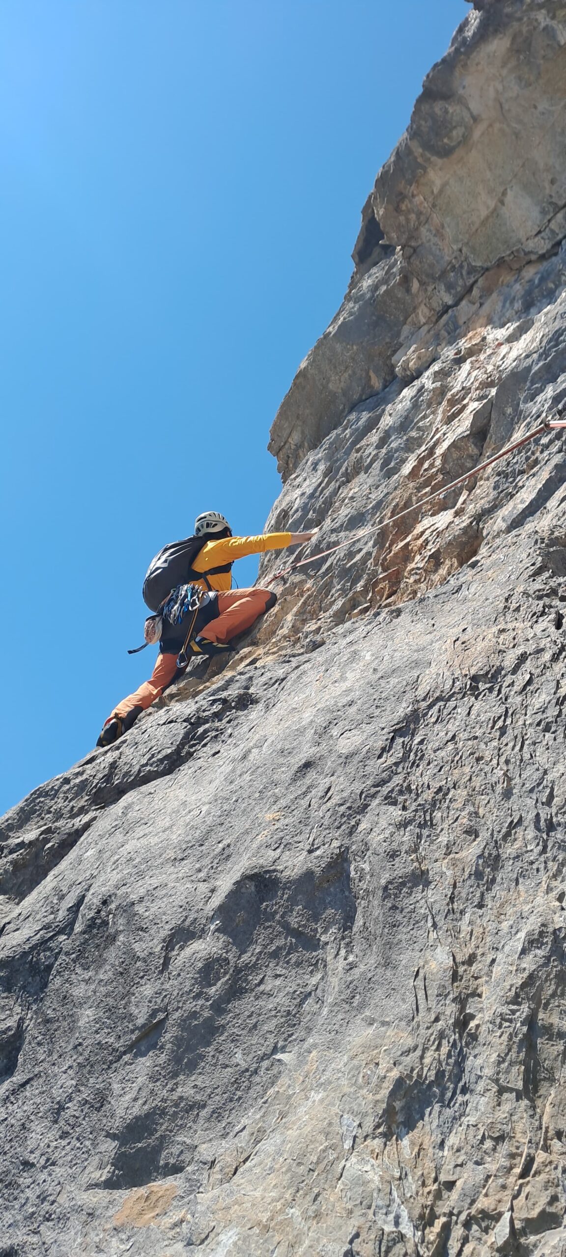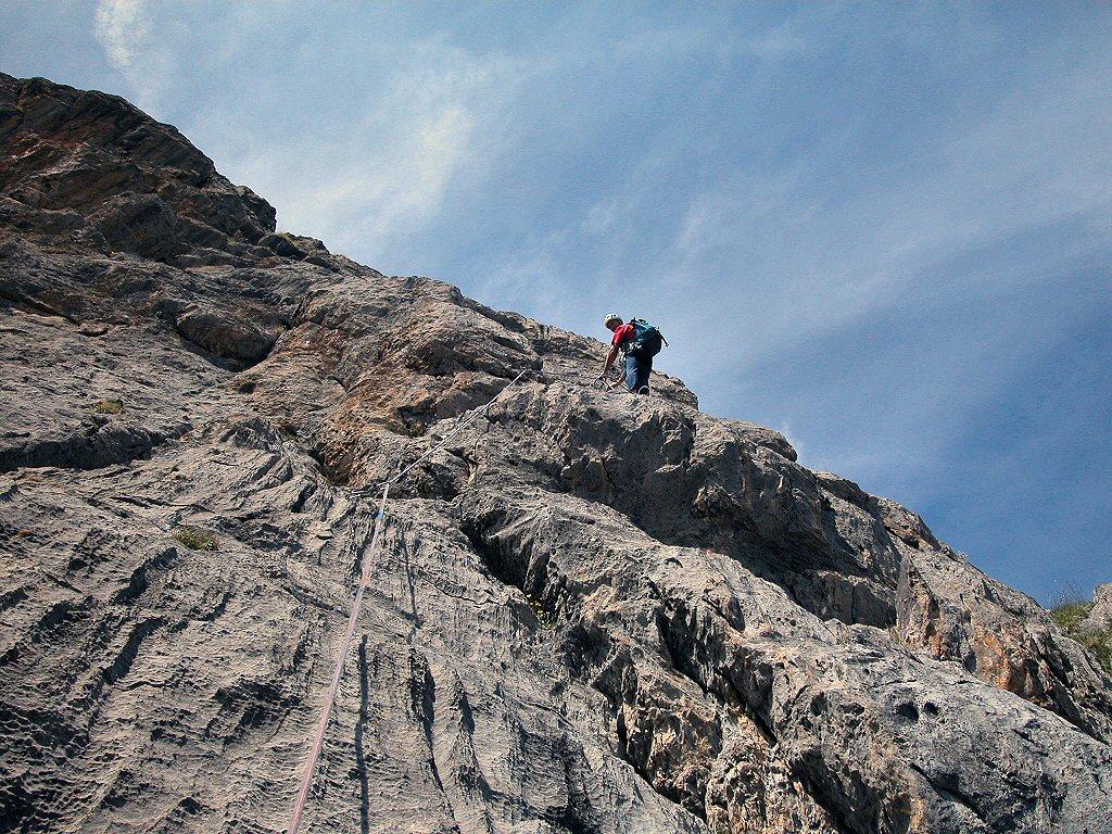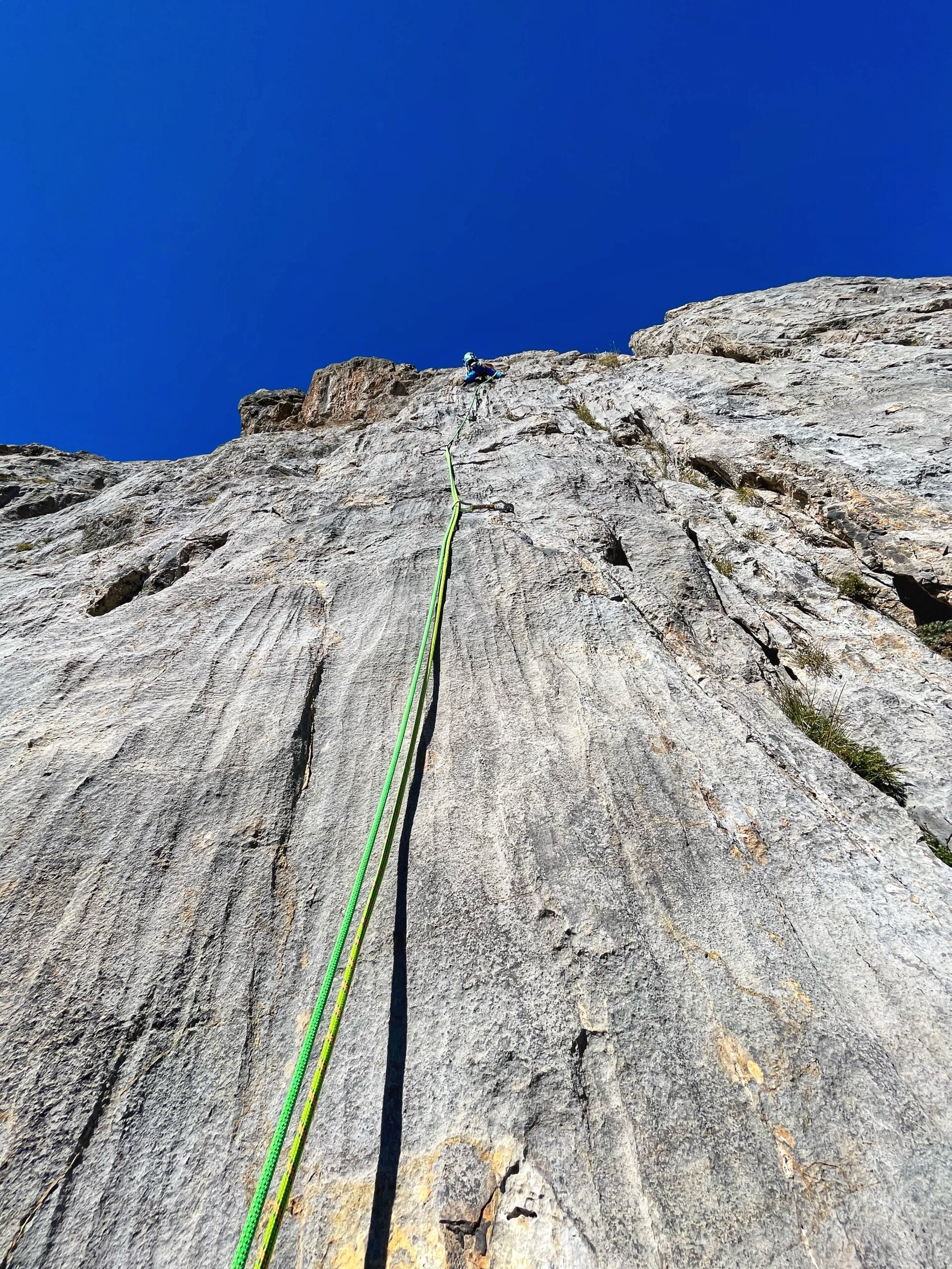 nota: questi due tiri disomogenei con il resto della via possono essere evitati proseguendo in salita la cengia fino all’attacco del III tiro (spit con cordone bianco)