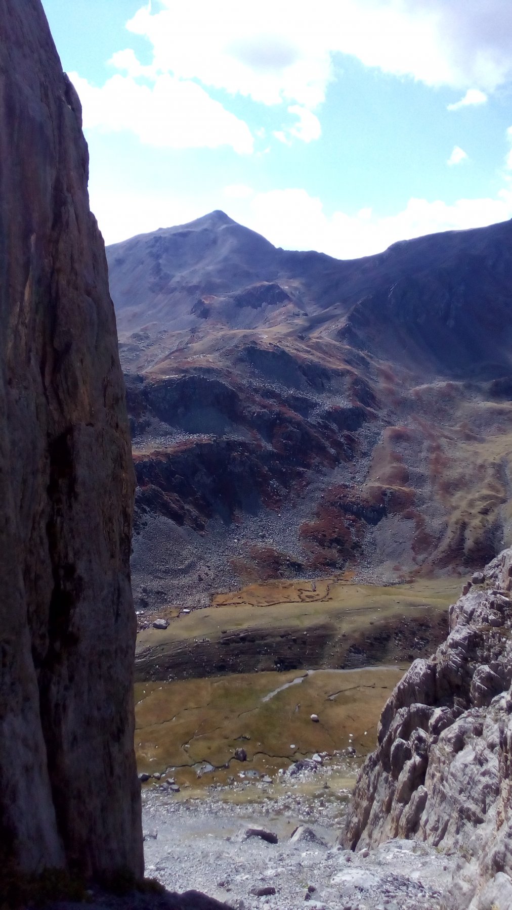Scavalcare il grosso masso (passo con spezzone di corda), traversare a dx e con un saliscendi (ometti) si arriva su una grossa cengia ascendente a destra dove parte la via.