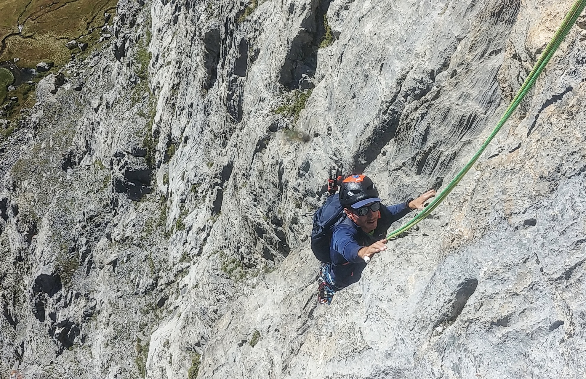 Discesa: in doppia sulla via, ma è consigliabile, per evitare di aspergere di pietre chi sale, scendere dal versante opposto; dalla sommità andare un poco a destra e fare una doppia di circa 20m ( calata segnata da ometto) in un canale pietroso e franoso che scende a sin., molto ripido all’inizio (possibilità di ulteriore doppia su un grosso masso), poi più comodo.