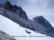- Seguire la cresta in direzione ovest fino ad incontrare un canalone (PD-) tramite il quale ci si abbassa fino a raggiunge in ghiacciaio e in breve le tracce di salita.