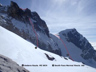 Dalla macchina seguire per tracce ben visibile fino alla laguna glaciale, circa a quota 5000. Da qui in breve si raggiunge il ghiacciaio. Puntare ora verso destra (est) ad un colletto. Raggiunto il colletto, circa 5260, ridiscendere dall’altro lato puntando alla base dell’evidente scivolo. Percorrerlo stando sul suo lato destro (AD-), circa 180 metri, 50°-55°. Una volta terminato si raggiunge, aggirando da destra la bastionata posta sulla sinistra, in breve la cima, che si trova sulla sinistra rispetto all’uscita dalla via.
