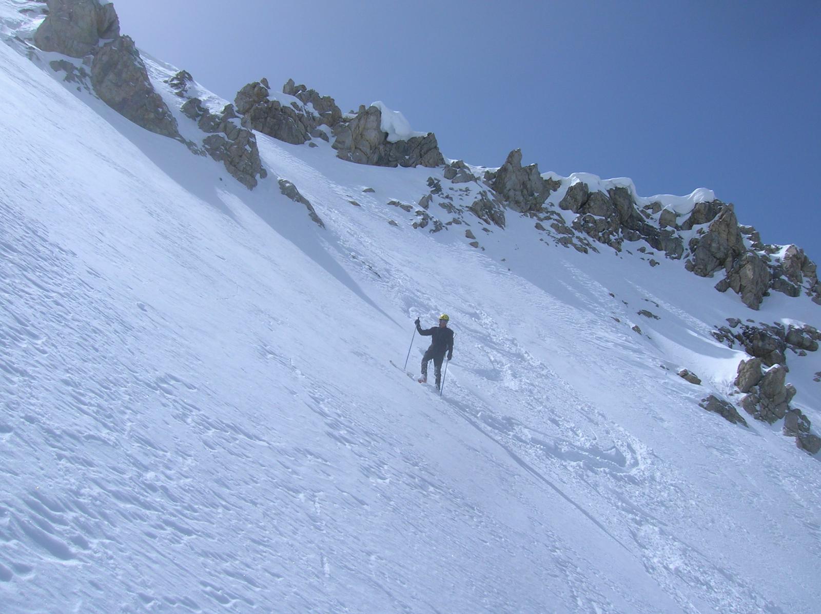 La discesa si svolge lungo l’itinerario di salita. Volendo, è possibile partire anche da un canale più dx (faccia a valle, est) con pendenze simili.