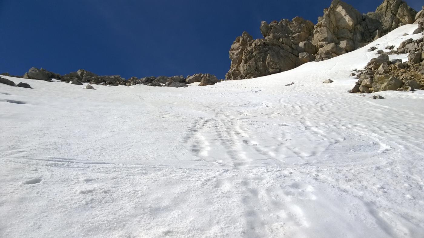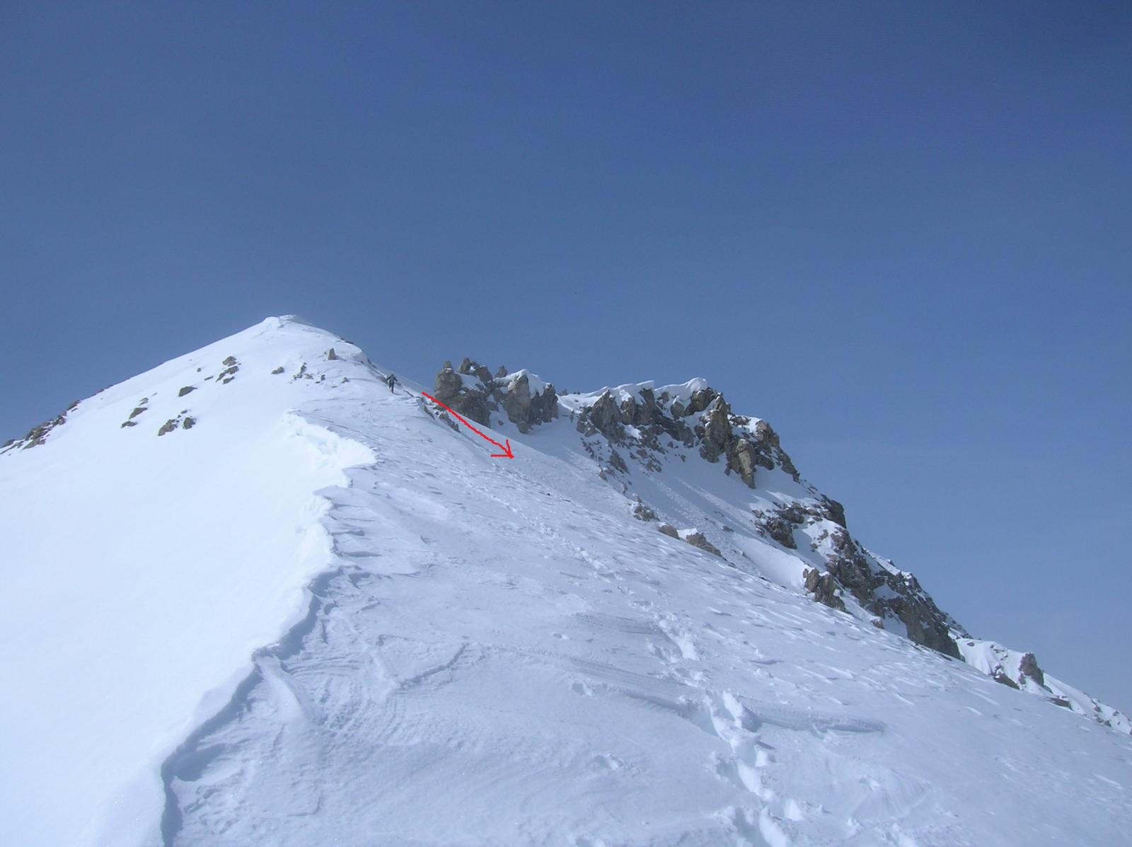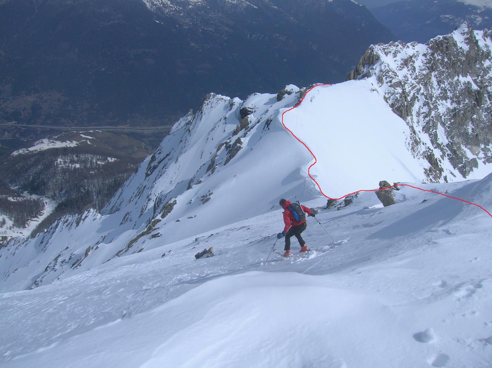 Giunti sotto la barra rocciosa spostarsi a dx in un canale ed aggirarla con un traverso deciso da dx a sx. Risalire brevemente (circa 30m) e quindi deviare di nuovo decisamente a dx, effettuando un altro traverso. Risalire quindi senza possibilità di errore il canale terminale che porta in cresta.