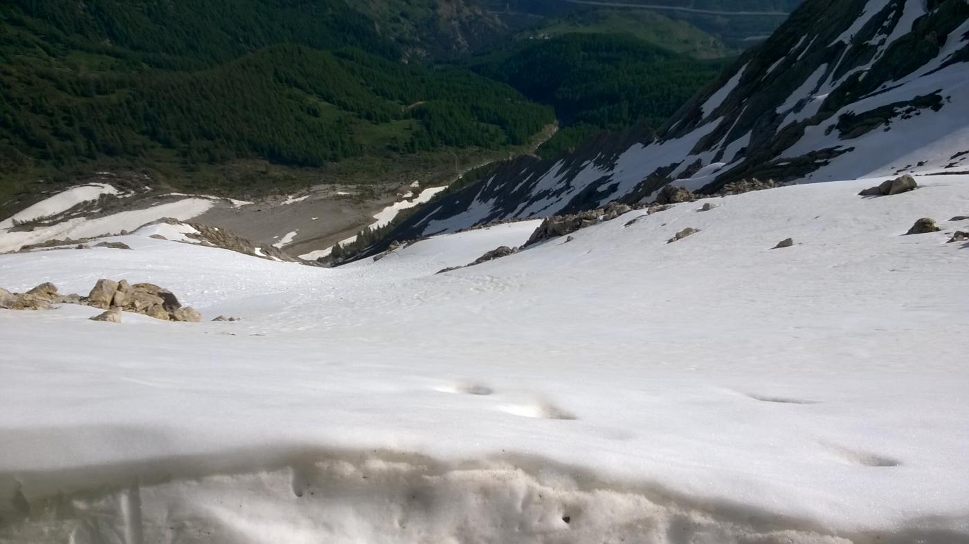 Ora i contro:1) portage di 450 mt (ma è fin poco, partendo da 1450mt…).2) Malgrado la mattinata limpida, niente rigelo. La neve da 2300 mt in su appena toccata dal sole diviene marcia, e a tratti sfondosa.3) Fondo un pò irregolare.