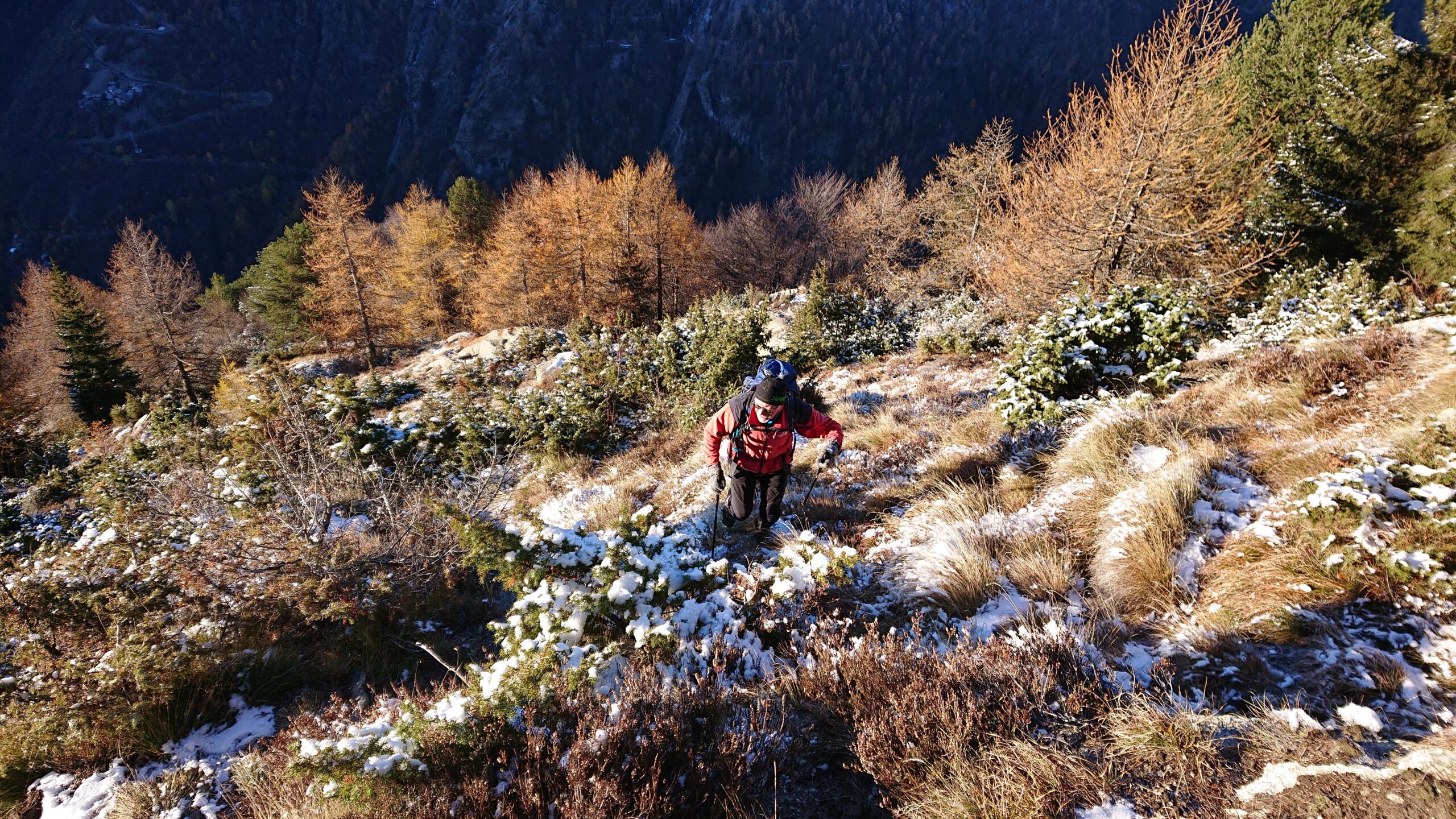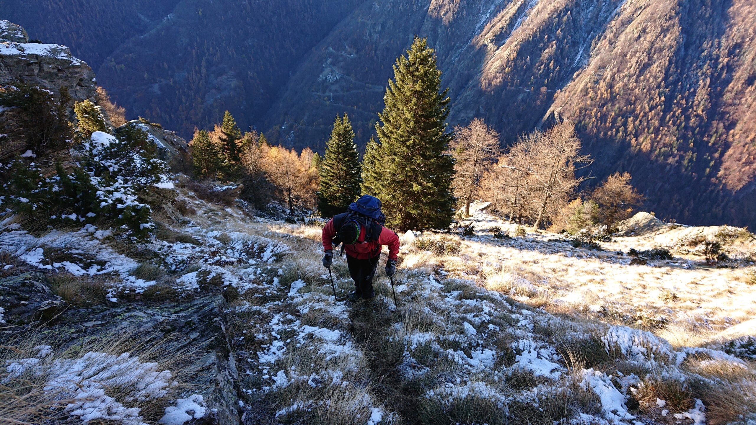 seguendo l’itinerario di salita, oppure è possibile scendere il versante est della montagna entrando nel canale sotto la madonna di vetta, fare attenzione a qualche saltino roccioso evitabile prima sulla sinistra faccia a valle e poi quasi in fondo al canale passare a destra e scendere nel bel bosco seguendo tracce di animali, così facendo si incrocia il sentiero 4C non molto lontani da Courtil.