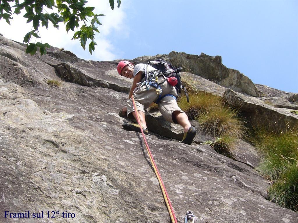 Con Gigi. Di veramente impegnativo c’è il terzo tiro, che noi abbiamo fatto solo grazie agli spit ravvicinati, da “mungere” alla grande! (ma qualcuno lo fa in libera?! Complimenti!). Per il resto la roccia è quella tipica della zona, senza grandi sorprese, alla fine anche un po’ noiosa. Consigliata a chi ama la placca. La cosa più degna di nota è la lunghezza: alla fine i piedi “fumano”! Ben spittata, ma qualcuno ha fatto saltare due o tre spit, per fortuna non indispensabili (chissà poi perché). Noi abbiamo utilizzato le due macchine, per evitare troppe doppie. Sei ore e mezza di arrampicata.