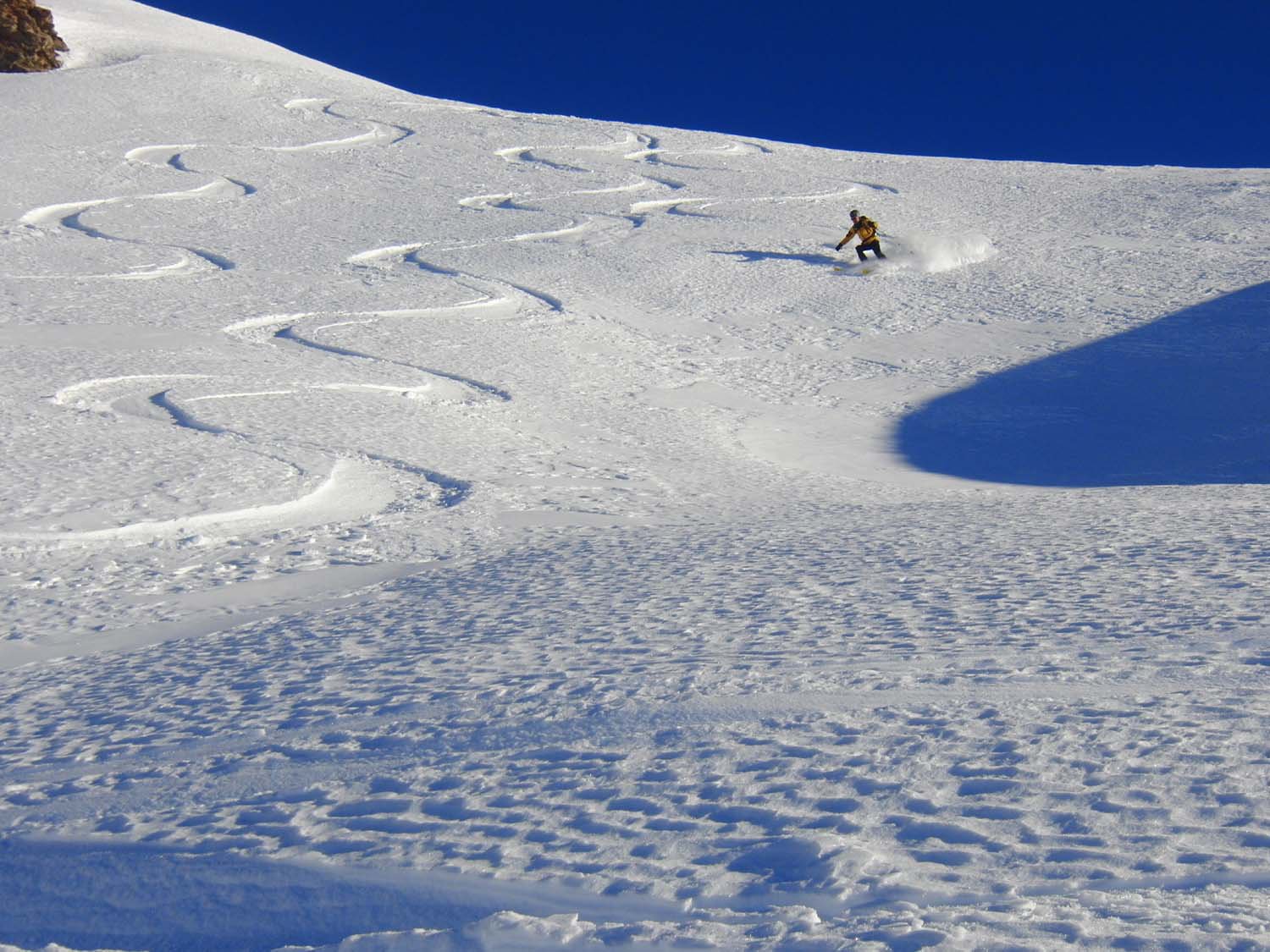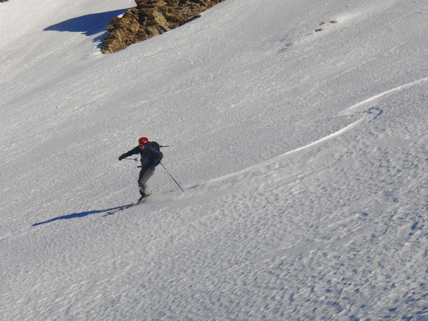 Discesa superlativa; la farina c’era su tutta la Comba; tratto un po’ tecnico su duro portante solo nel ripido dei pinetti del Rebanc, poi in basso strato di galaverna sul portante; risalita breve a piedi sotto La Chau poi discesa sulla pista fresata fino all’auto.