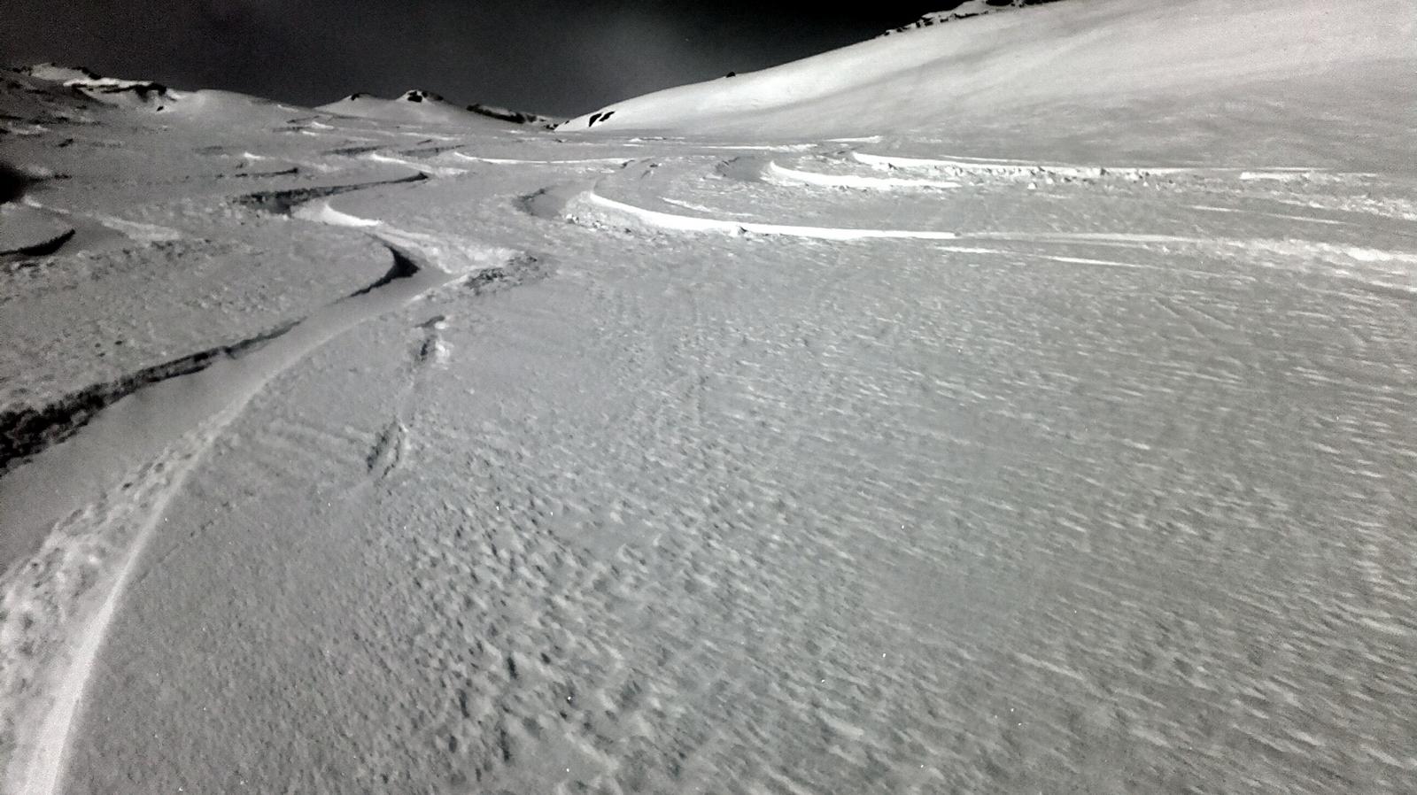 Mi sono fermato al colle avvolto da un nebbione/nuvolone. Un po’ di vento fastidioso ma per il resto neve spettacolare. Ero da solo e dato che non c’erano tracce di salita – per non dovermela battere tutta – ho risalito a mo’ di salmone le numerose tracce dell’eliski. Rivolgo un invito a coloro che vanno in montagna e si collegano a Gulliver solo per leggere. Ci sono tante persone che non hanno la vostra fortuna e in montagna magari non ci possono più andare. Quando leggeranno le vostre avventure e guarderanno le vostre foto, gli regalerete un po’ delle vostre emozioni…grazie millissime