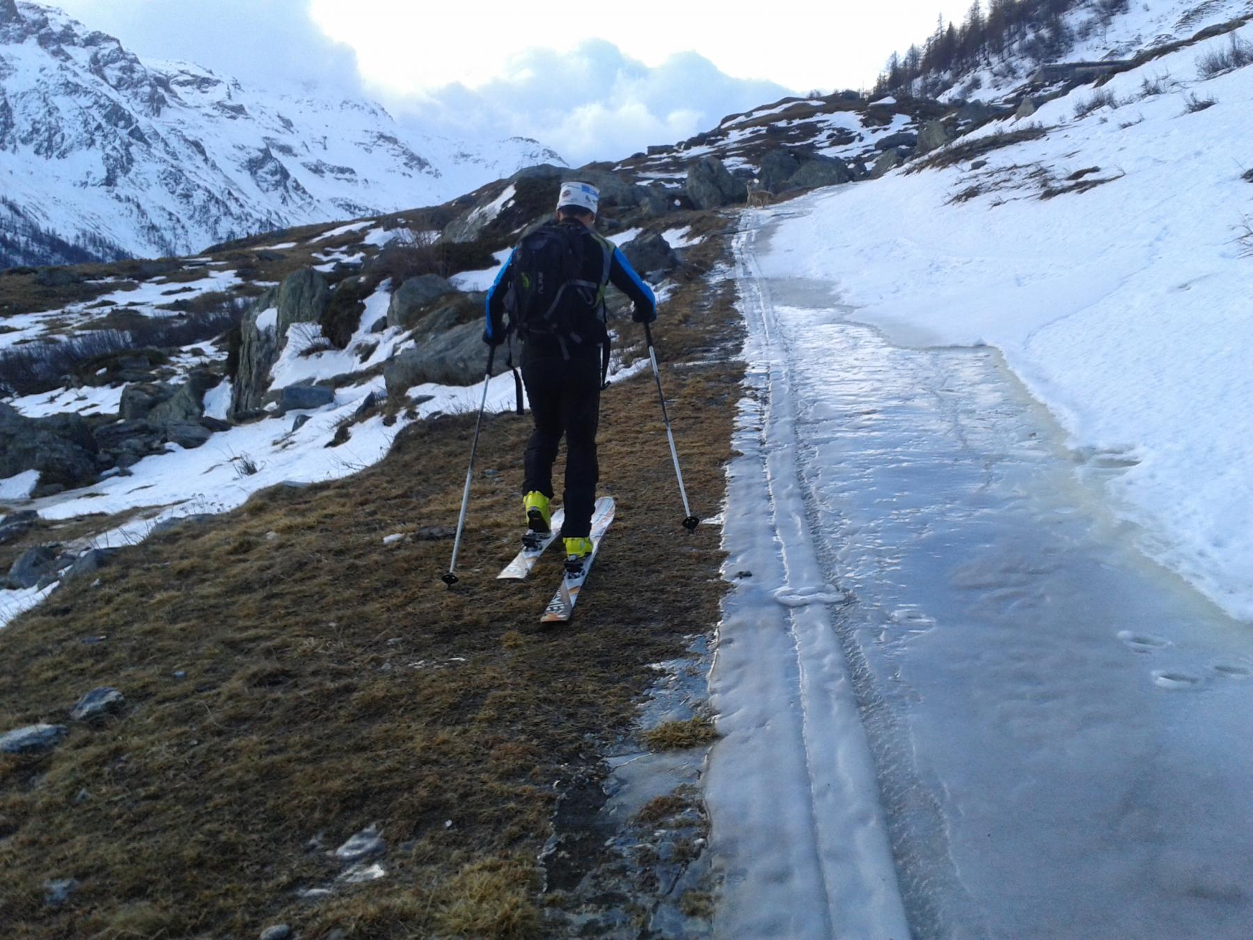 Dal pianoro oltre l’alpeggio neve portante (più o meno). Ci siamo fermati al colle dello Chateau ben stufi di essere schiaffeggiati da folate di vento…non freddo fortunatamente. Solo un piccolo tratto sul ghiacciaio con sastrugi. Per fortuna sempre ben sciabile (erba a parte).
