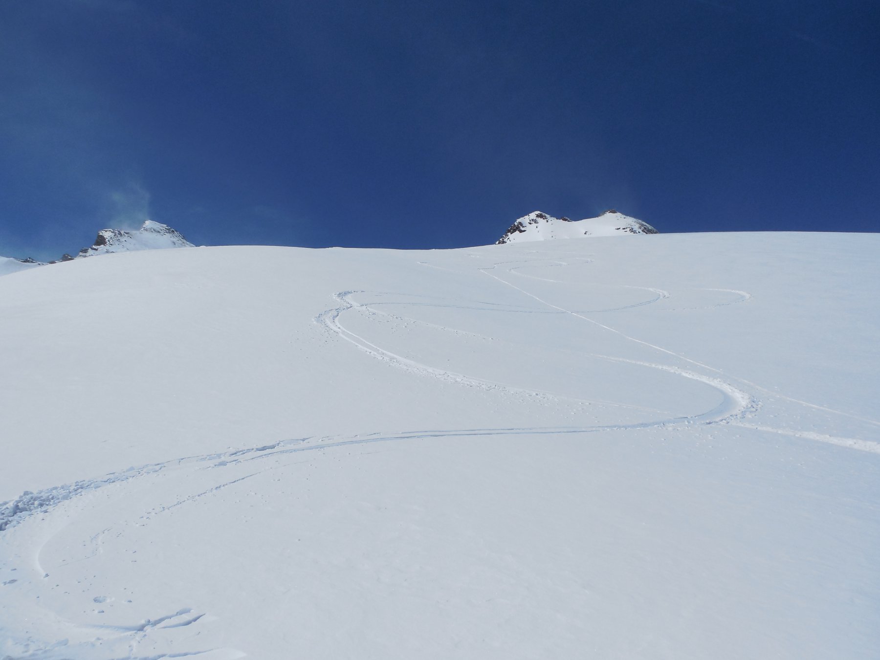 In discesa bella neve dalla cima fin dopo il ghiacciaio (ventata ma morbida e ben sciabile), poi primaverile con piccoli accumuli da vento qua e la, ma sempre discretamente sciabile.