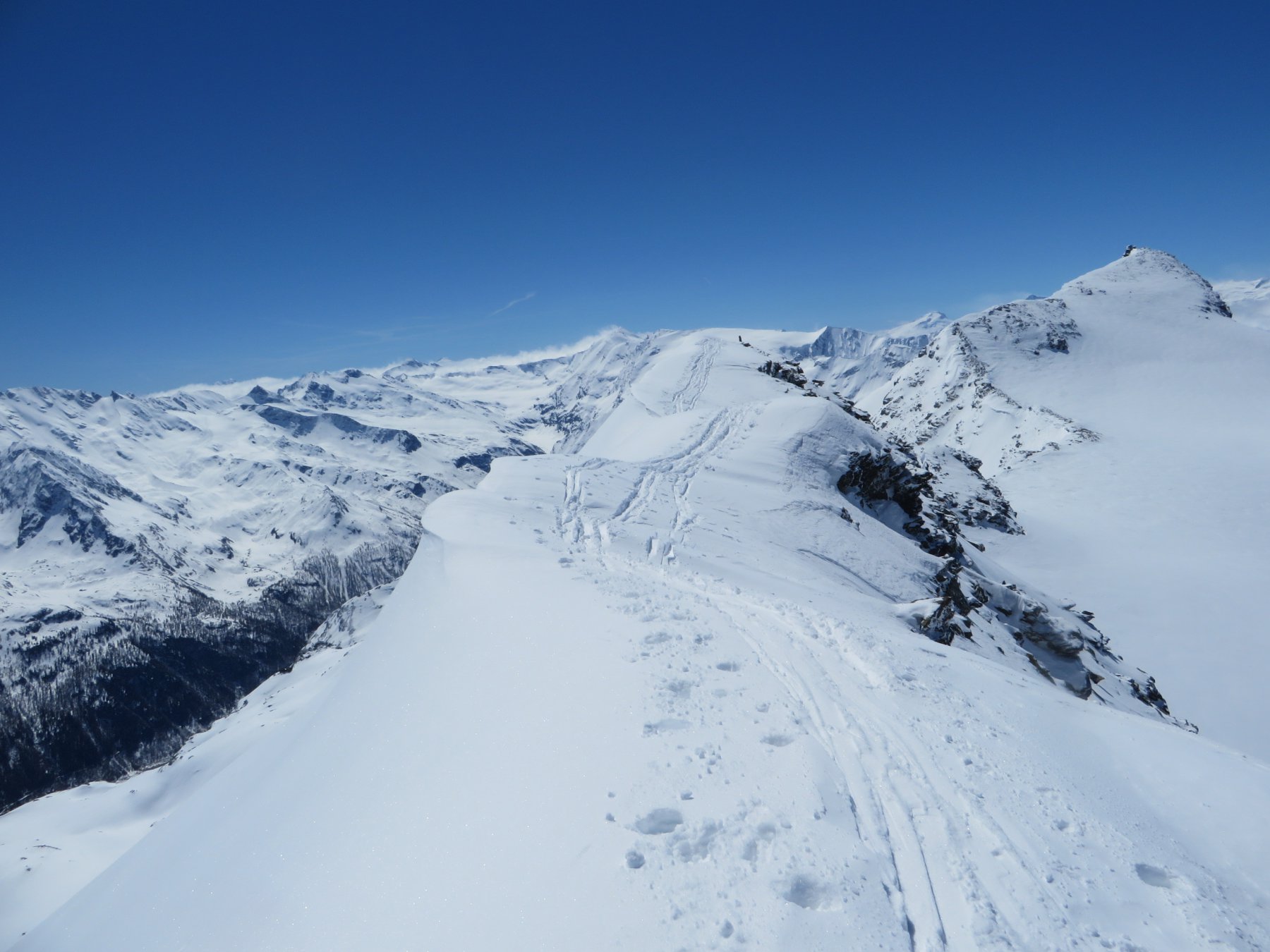 30/40 minuti di portage fino circa a 1800mt scavalcando vecchi coni di valanga. Neve dura fino al ghiacciaio. Rampant necessari. Cresta con molta neve, da tracciare ma agevole da percorrere. Primo pendio su 20cm di neve farinosa, ottima. Niente vento forte ne le temperature glaciali previste, ma l’arietta fresca ha consentito una bella salita e non ha fatto mai mollare la neve in discesa. Il risultato è che la sciata ha patito un po’ il terreno duro. Comunque tutto sommato non male. Per valanghe siamo arrivati a 10 minuti dall’auto. Incredibilmente nessuno in giro, solo noi in una giornata strepitosa e su un percorso molto bello. Con la grande compagnia di Simo, Enri e Giacc.