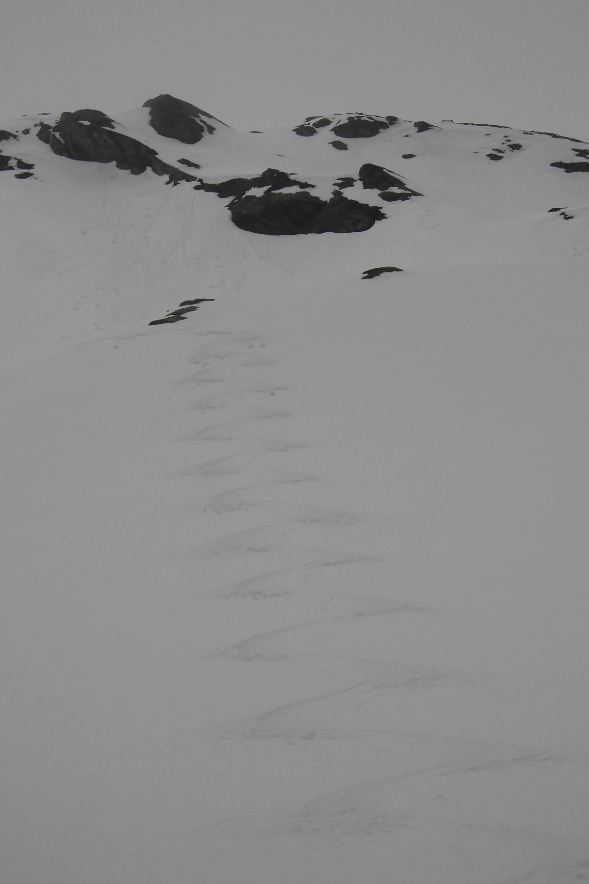Rapida discesa dal pendio nord in bella farina. Sul tratto in piano del ghiacciaio crostraccia, ma appena cambia l’esposizione (da N a E) e aumenta la pendenza la neve si trasforma e diventa un bel firn che permette bellissime serpentine fino a Orfuilles. Sui tratti piu’ ripidi dai 2500m in giu’ la neve è particolarmente umida e lo strato superficiale (20/30cm) scivola su quello sottostante, ma al momento nulla di preoccupante.