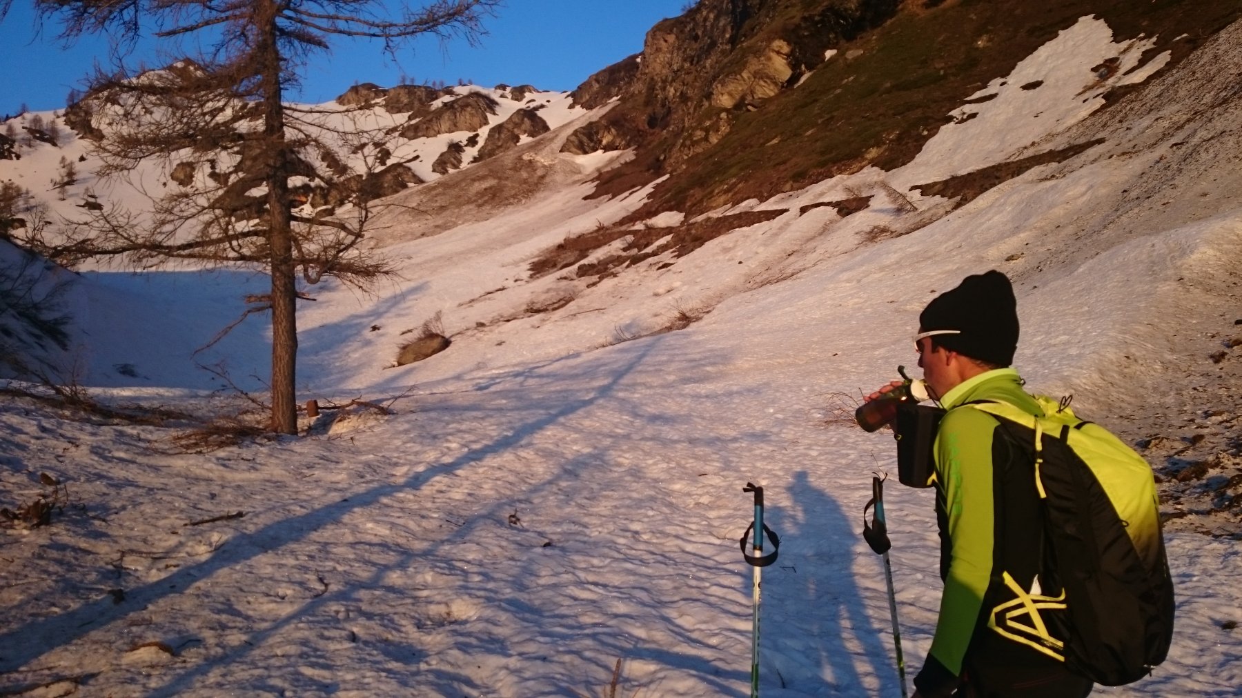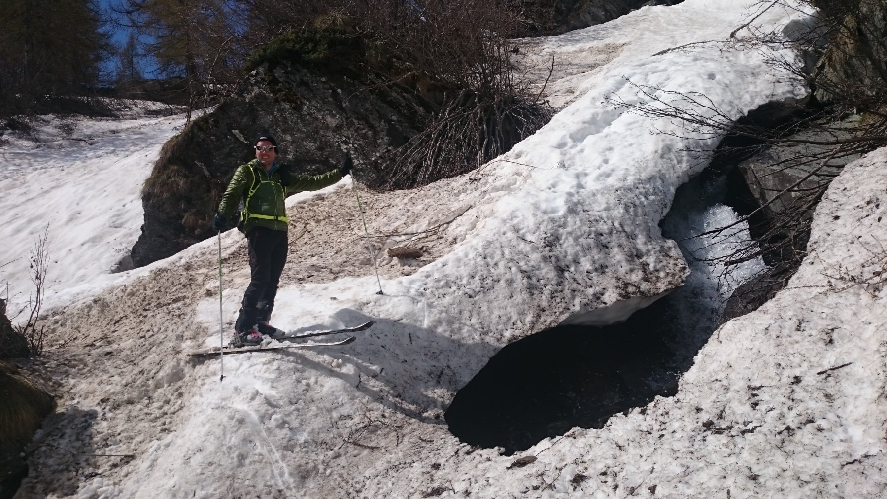 Condizioni ottime per il Chateau Blanc, rigelo buono sino al pendio finale rivolto a nord, qui 20 cm di farina da tracciare. Condizioni di sicurezza ottime, iniziato discesa alle 10 ed è meglio non tardare troppo, i pendii prendono sole dalle 6 del mattino. Sci dalla vetta su divertente farina sino al ghiacciaio, poi splendido firn sino sotto alle prime baite. Poi cinghialando su valanghe abbiamo tolto sci a 5 minuti dalla macchina. In salita portato sci sino al pianoro sotto prime baite. Occhio ai fragili ponti di neve per scavalcare i numerosi torrenti nella parte iniziale della gita!