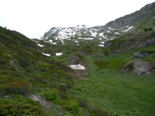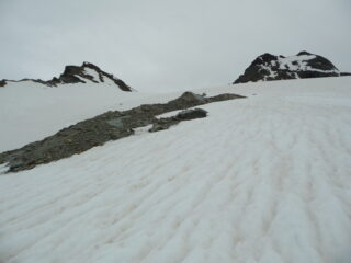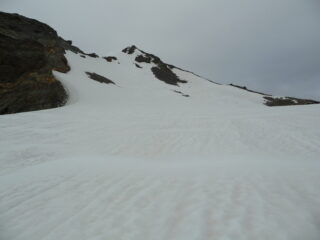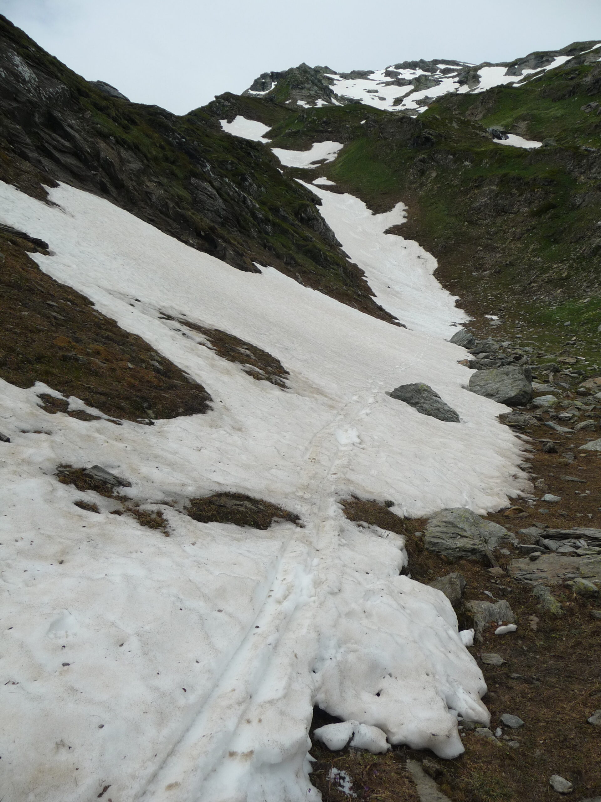 Sci in spalla per quasi 1000m in salita in discesa con qualche metti leva si arriva ancora 800m sopra Planaval. Salito con cielo coperto e un buon fresco per la stagione. Discesa divertente su neve estiva con molte rigole…