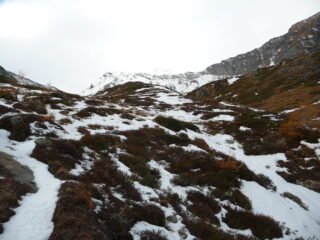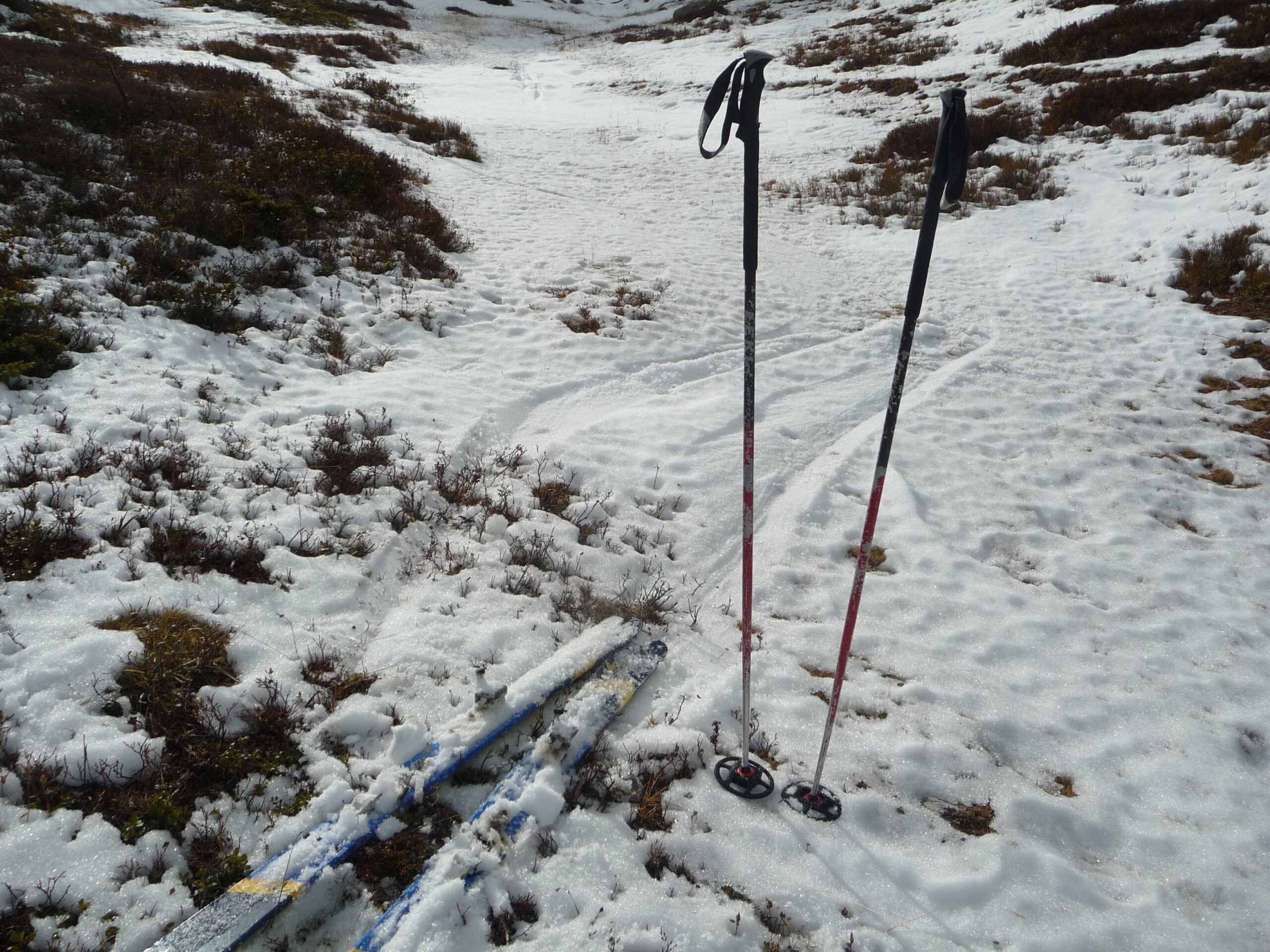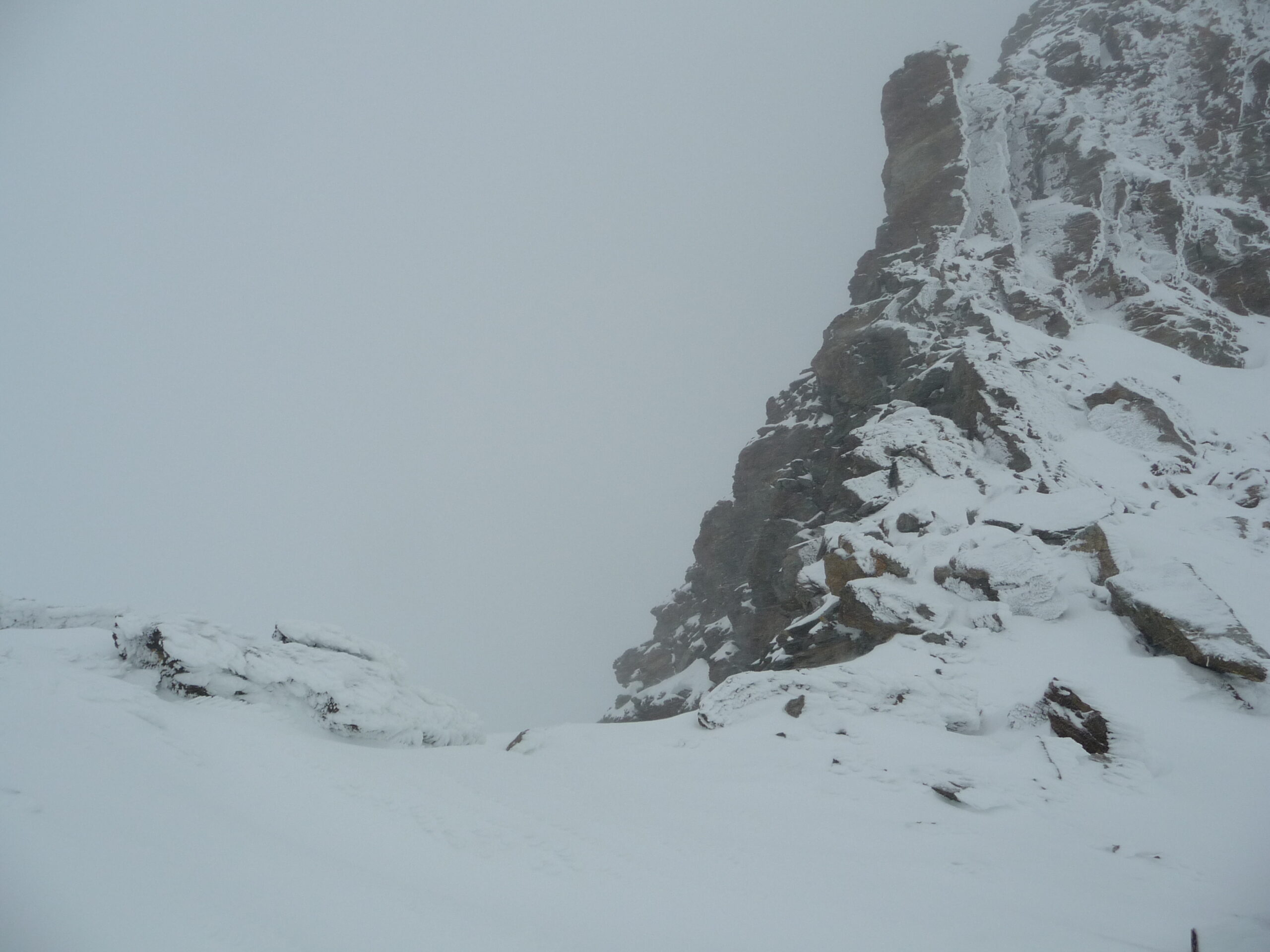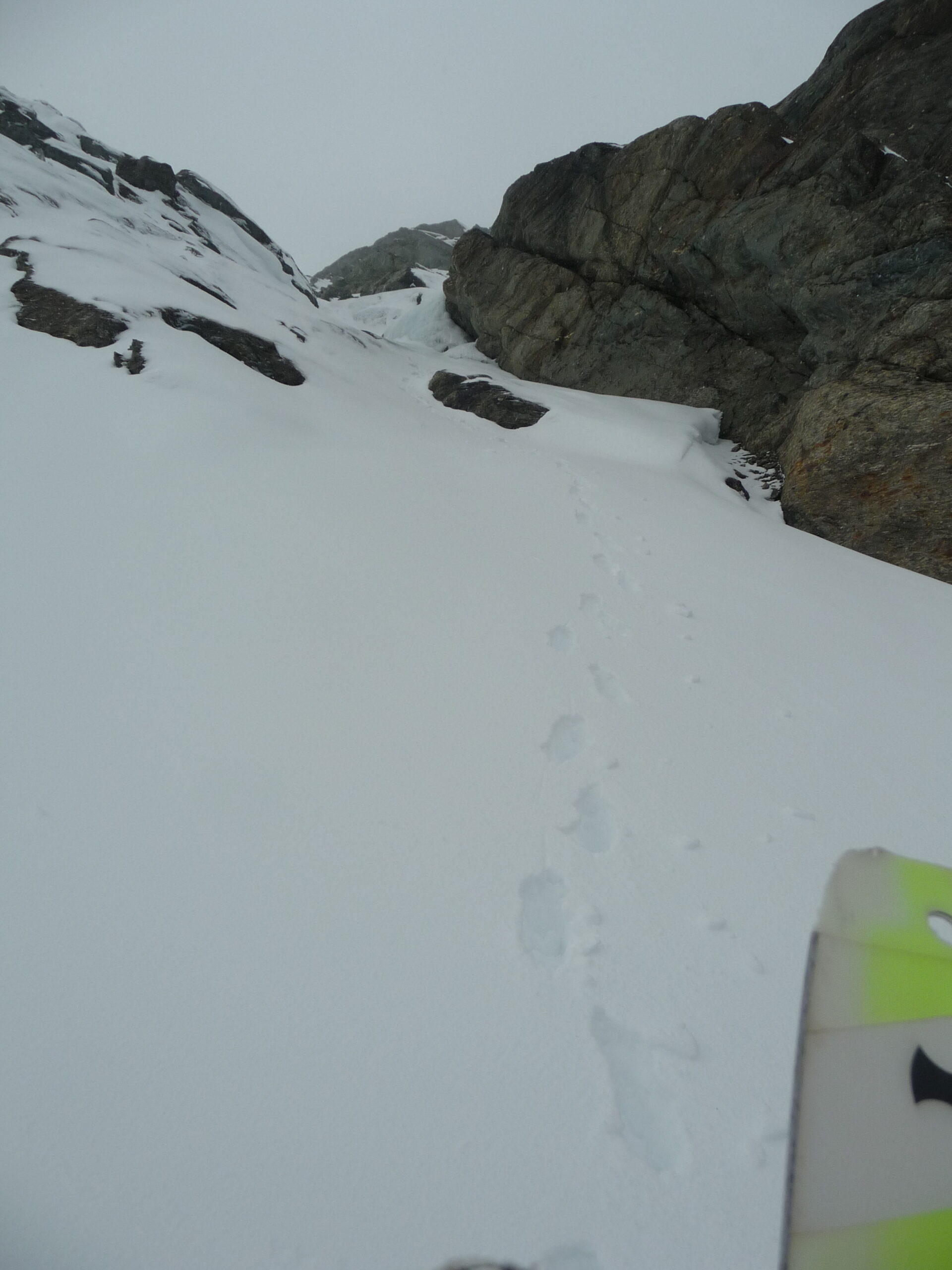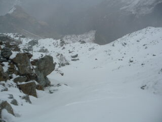 Pochissima neve anche in alto bisogna arrivare sul ghiacciaio per non vedere più pietre. Fermati al colle sotto leggera nevicata e scarsa visibilità. Discesa pessima dove c’è la neve è pure una brutta crosta…