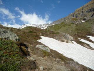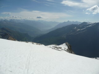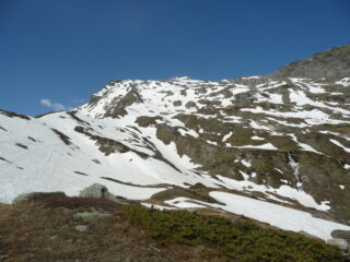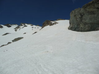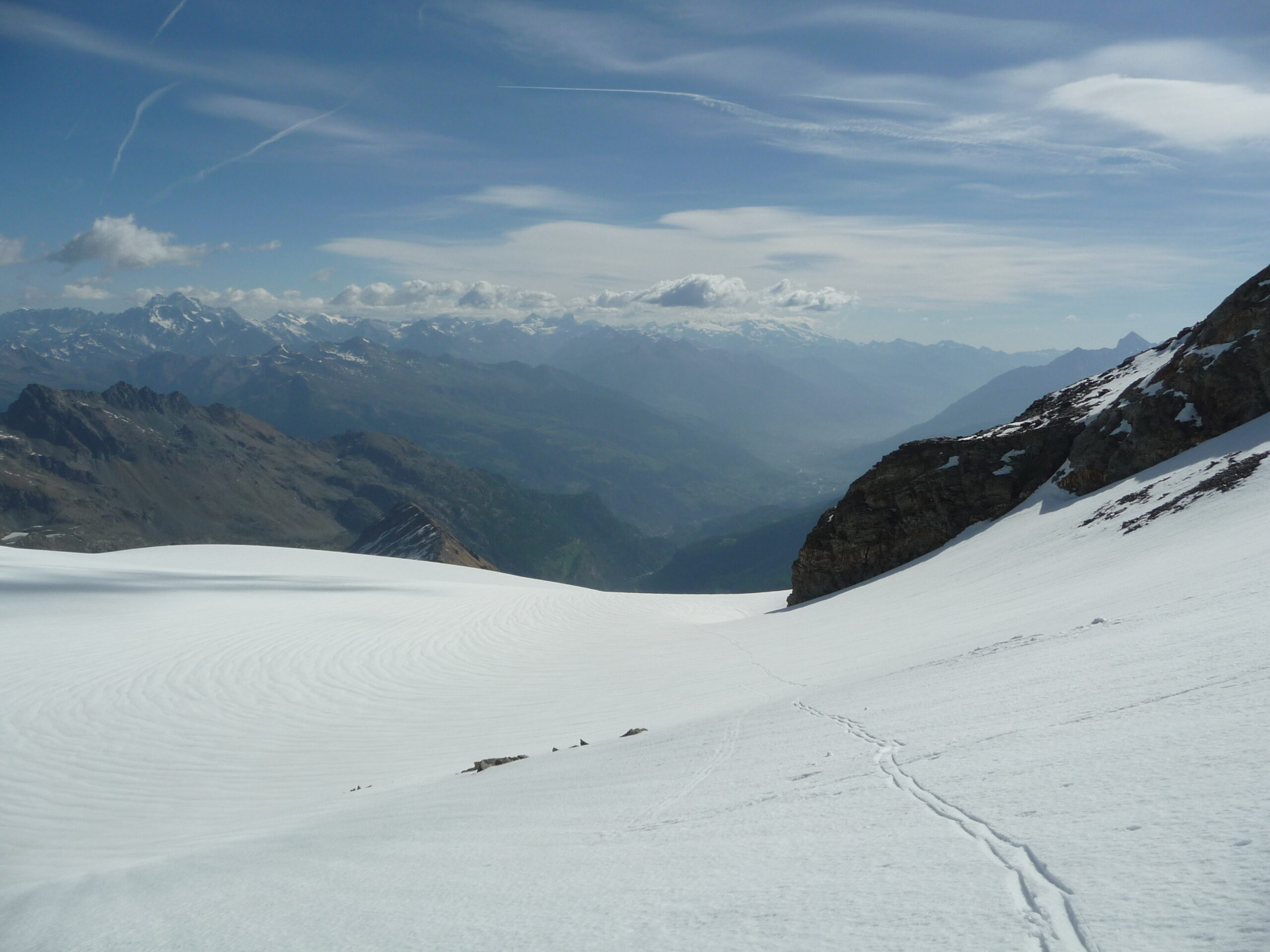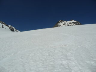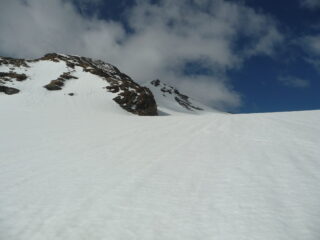 La neve da settimana scorsa arretrata di circa 100m ora gli sci stanno nello zaino per circa 700m. Oggi rigelo nullo fino in punta e molto caldo. Fortunatamente un pò di venticello ha agevolato la salita. Fermato poco sotto la vetta perchè qui il vento era a raffiche molto forti… In discesa sci d’acqua su neve bagnata ma tutto sommato quasi mai sfondosa.