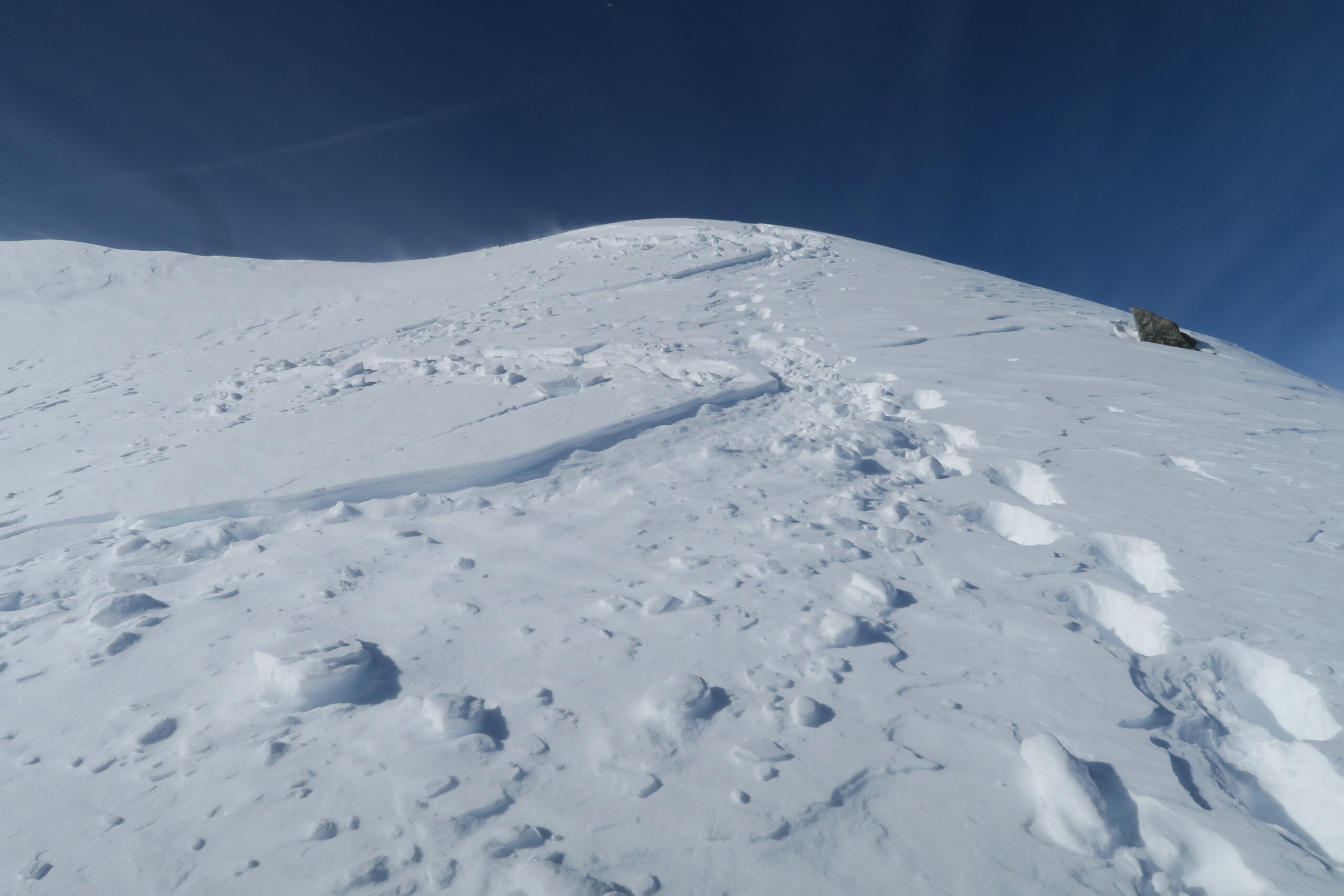 Fatto a piedi l’ultimissimo tratto di cresta prima della cima perchè il vento aveva accumulato un pò troppa neve e non mi sono fidato di salirlo con gli sci ai piedi.