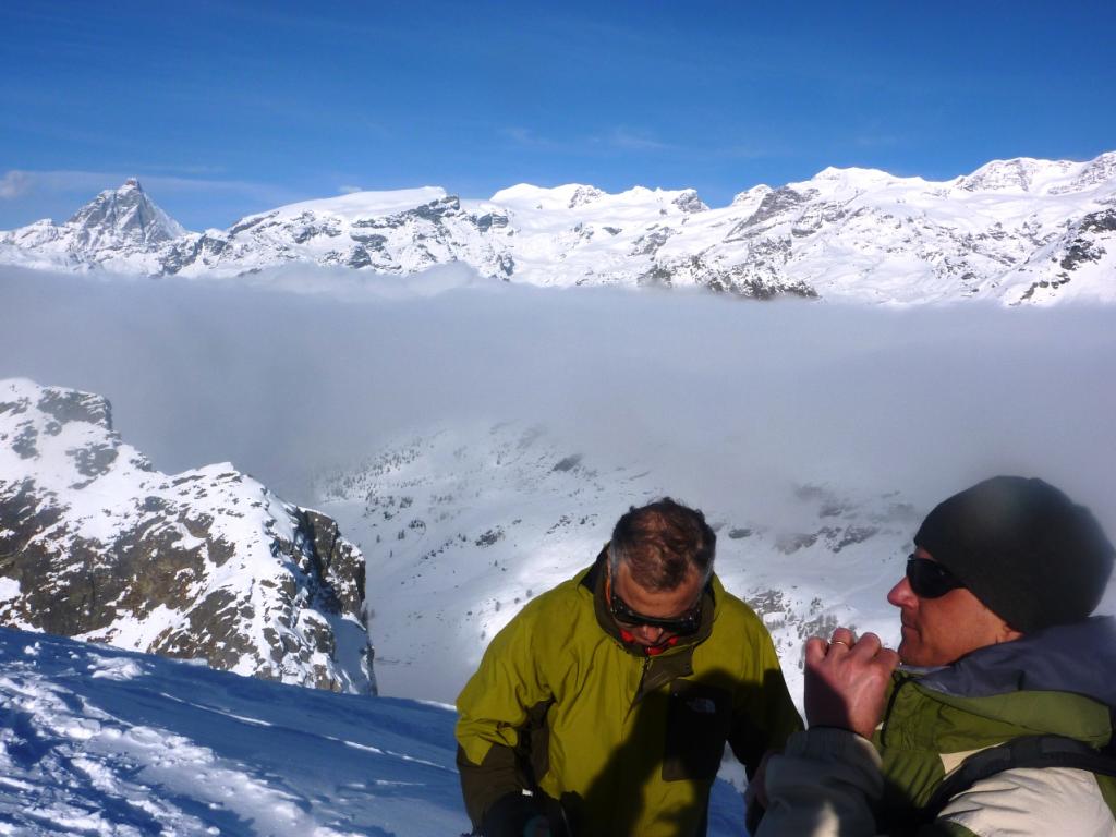 Giornata che in maniera del tutto inaspettata si e’ aperta e ha offerto uno spettacolo incredibile sui 4000 dal cervino alla capanna margherita. Dal colle salita fino alla cima non quotata fattibile anche con gli sci anche se io ho optato per scollinare la cima del pendio a piedi per non sollecitare troppo il pendio alla base delle rocce che mostrava qualche piccola spaccatura. Forse prudenza eccessiva, cmq c’e’ tanta neve e nel caso si alzino le temperature attenzione a farsi attrarre dai pendii vergini sulla dx.per il resto gita tranquilla e bellissima con grande panorami e bella sciata nella prima meta’ (poi troppa neve e pesante). Mascognaz una meraviglia. Enrico e il giaccone una compagnia super (anche per il dopo gita mangereccio e bevereccio). Fantastica giornata. Buone gite a tutti.