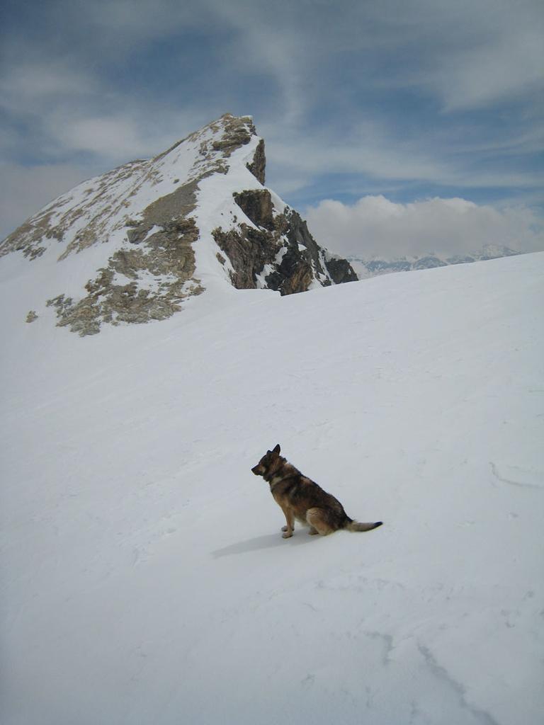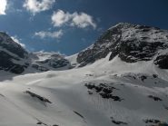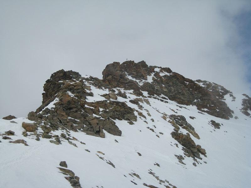 percorrerlo al centro fino a circa 3000 mt. e passando a destra o a sinistra, a seconda delle condizioni, dell’evidente isolotto roccioso, raggiungere il colle. a destra brevemente per la punta che si raggiunge facilmente a piedi. in punta è d’obbligo suonare la campana.