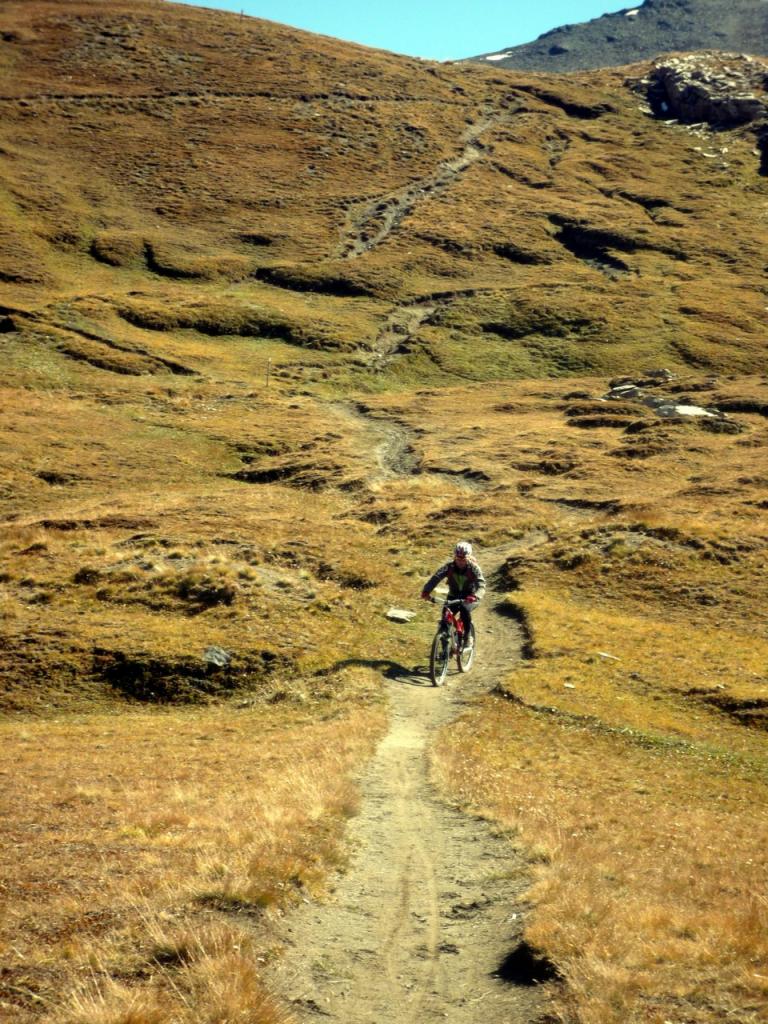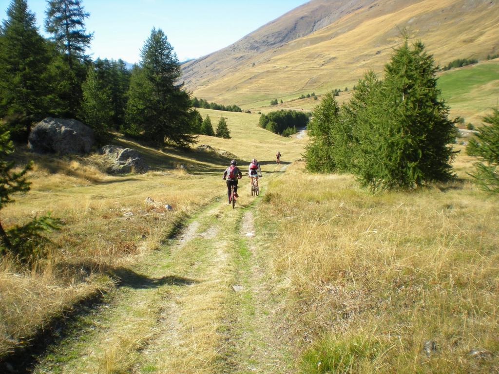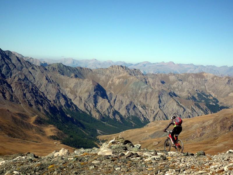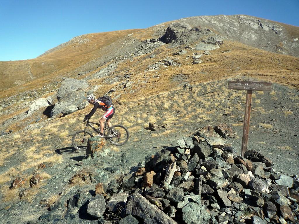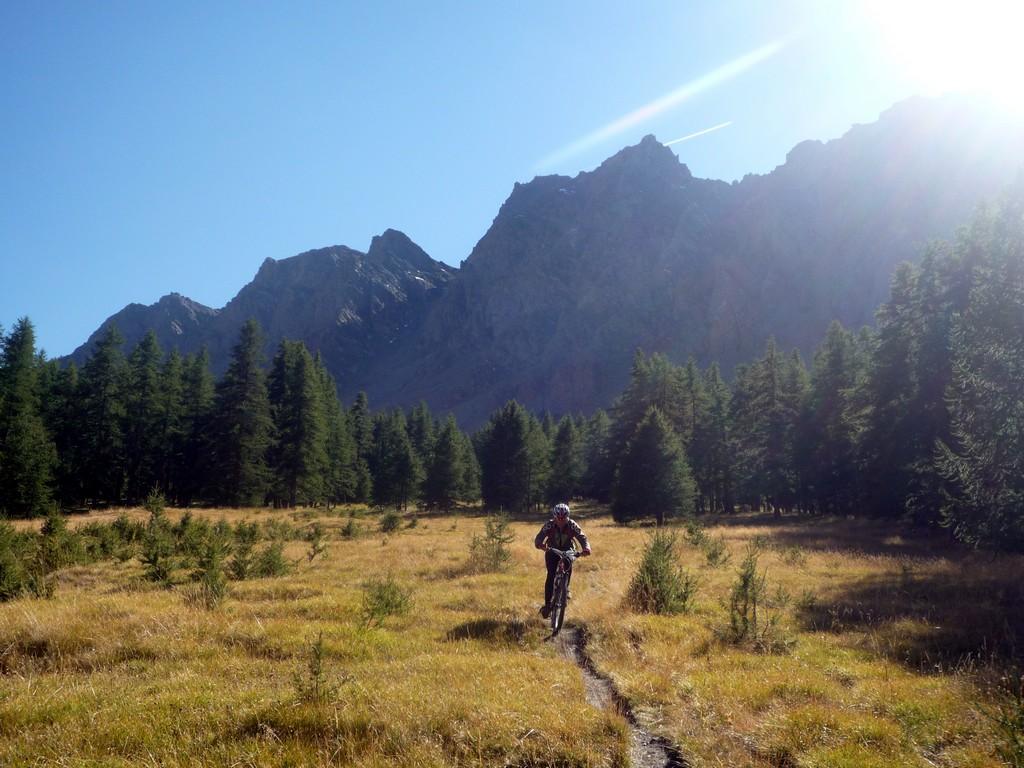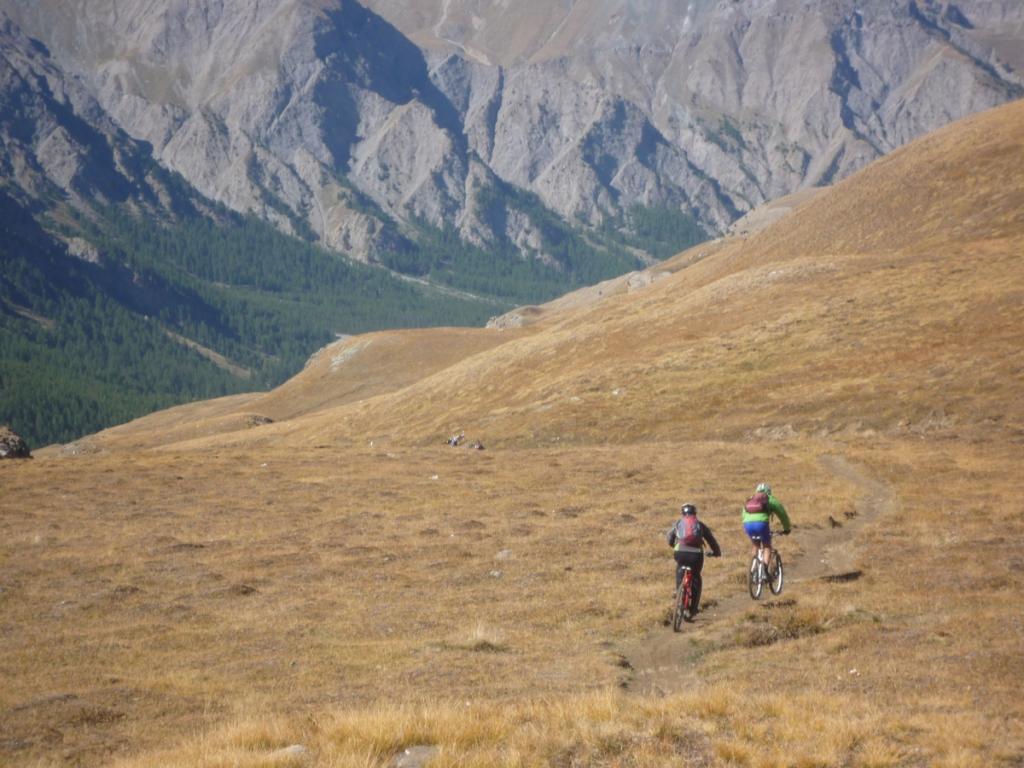 Da Fontgillarde si sale fino all’ex dogana dove si imbocca l’evidente sentiero verso il colle chamoussieres. La prima parte è ciclabile, poi, dove il sentiero attacca più deciso il pendio si inizia a spingere, praticamente fino al colle (30-40 minuti). Un pianoro prima del passo concede però la soddisfazione di scollinare in sella! Si prende il GR 58 verso Saint Veran: fondo ottimo e veloce, veramente una goduria! Dove il sentiero incrocia la strada verso la chapelle de clausis svoltare a sx (verso monte), si supera un ponticello e si imbocca il sentiero a dx: prima tornantini, poi veloce nel bosco, poi sterrata fino a Saint Veran. Alle porte del paese (visita consigliata!), si ritorna su larga sterrata compatta verso monte; dopo un pilone votivo, nei pressi di un piccolo parcheggio, prendere a sx (indicazioni col longet). Salita energica tra i pascoli fino all’osservatorio del Pic di Chateau Renard 2020 me quindi in 5′ si arriva in cima a piedi (panorama stupendo).