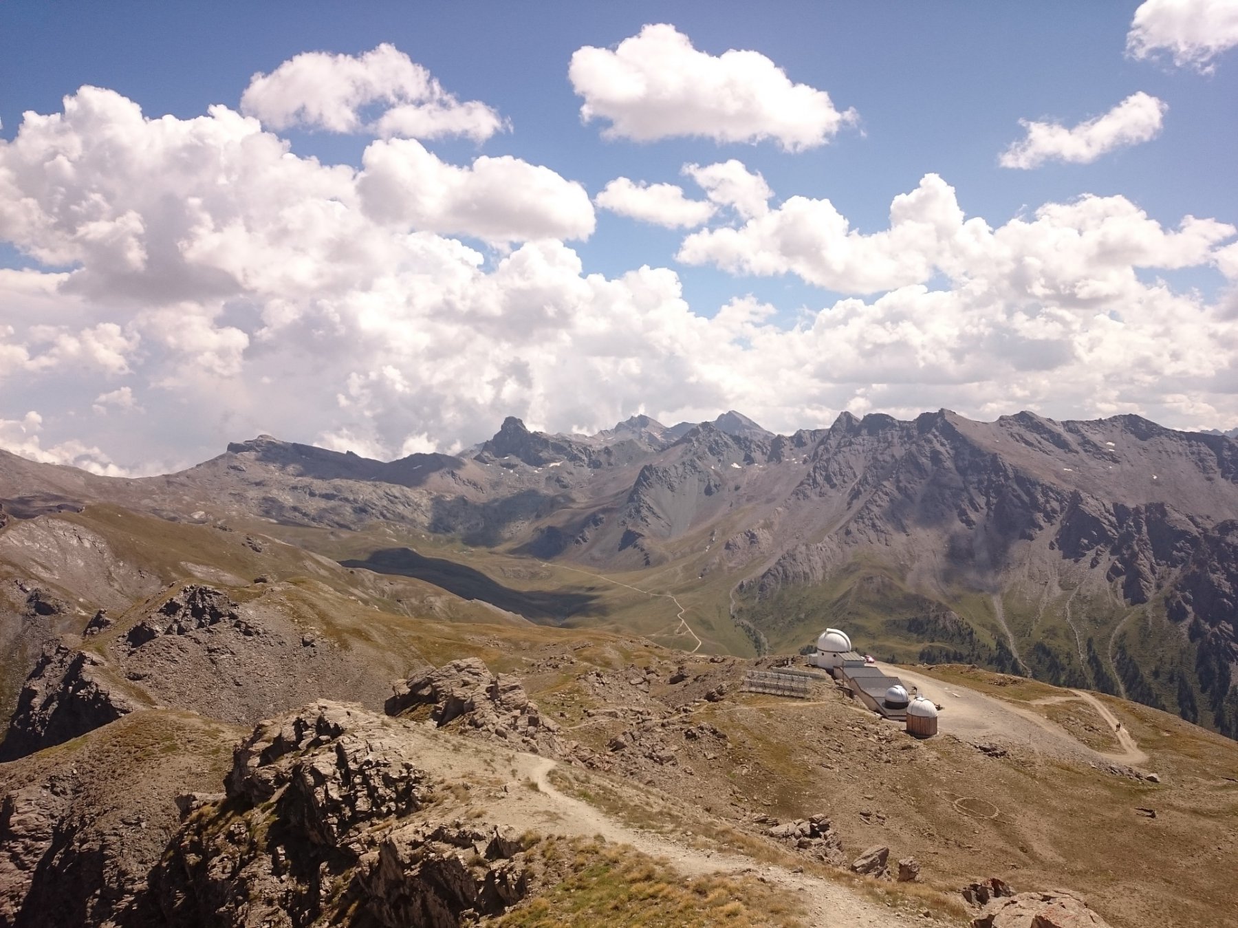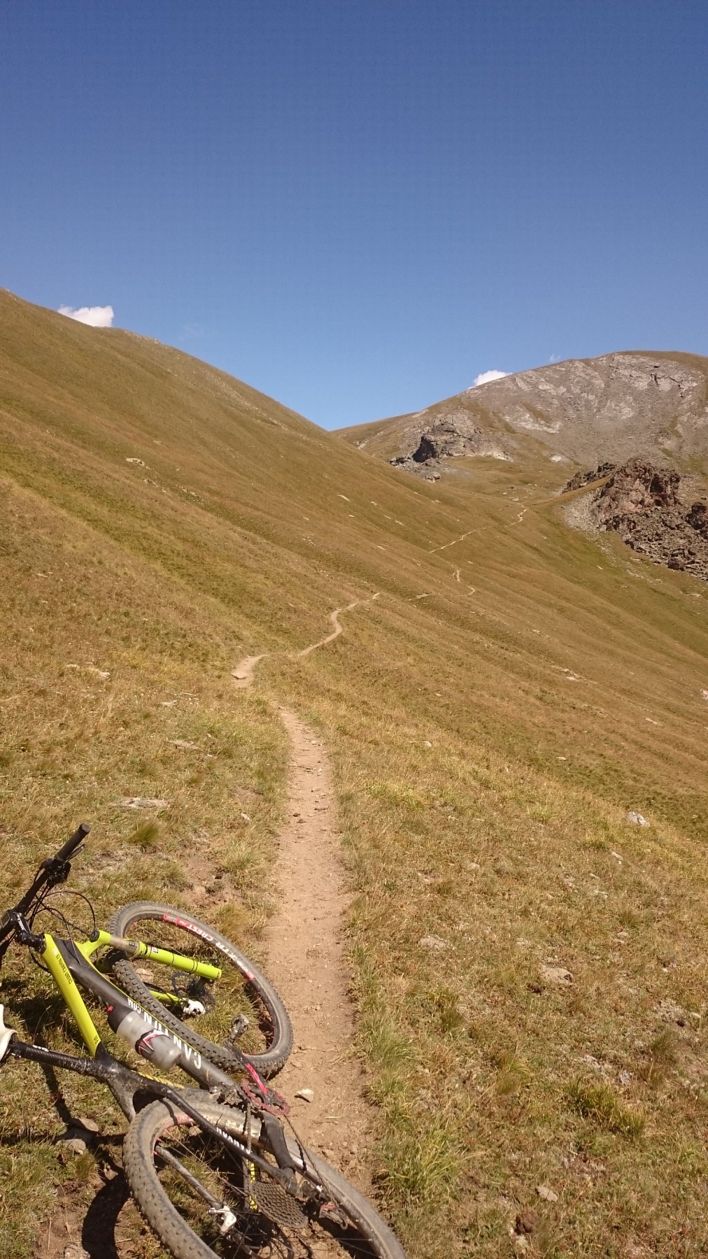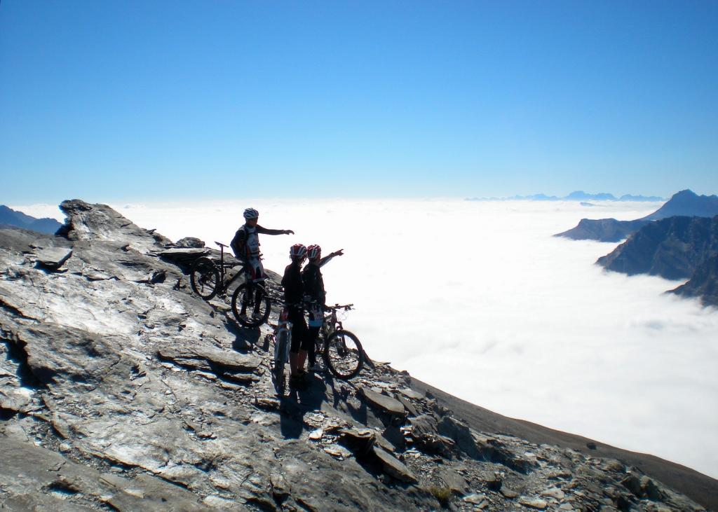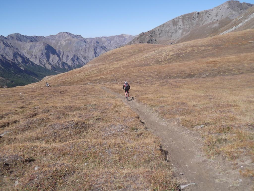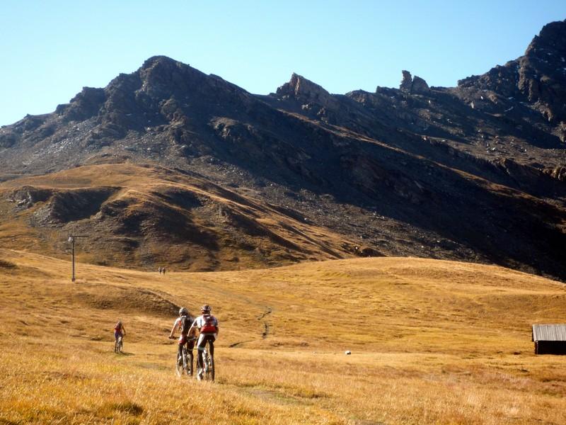 Da Fontgillarde si sale fino all’ex dogana dove si imbocca l’evidente sentiero verso il colle chamoussieres. La prima parte è ciclabile, poi, dove il sentiero attacca più deciso il pendio si inizia a spingere, praticamente fino al colle (30-40 minuti). Un pianoro prima del passo concede però la soddisfazione di scollinare in sella! Si prende il GR 58 verso Saint Veran: fondo ottimo e veloce, veramente una goduria! Dove il sentiero incrocia la strada verso la chapelle de clausis svoltare a sx (verso monte), si supera un ponticello e si imbocca il sentiero a dx: prima tornantini, poi veloce nel bosco, poi sterrata fino a Saint Veran. Alle porte del paese (visita consigliata!), si ritorna su larga sterrata compatta verso monte; dopo un pilone votivo, nei pressi di un piccolo parcheggio, prendere a sx (indicazioni col longet). Salita energica tra i pascoli fino all’osservatorio del Pic di Chateau Renard 2020 me quindi in 5′ si arriva in cima a piedi (panorama stupendo).