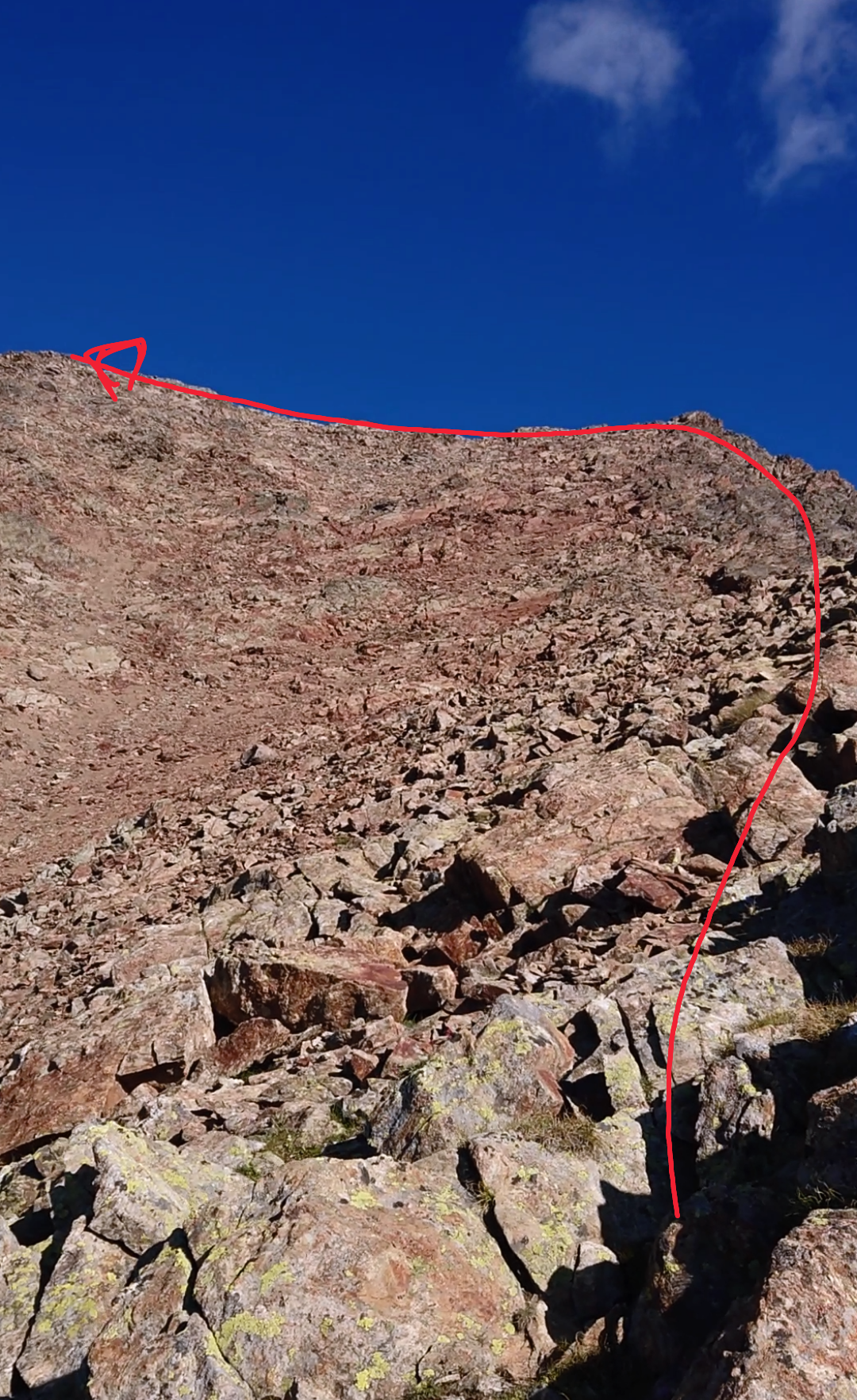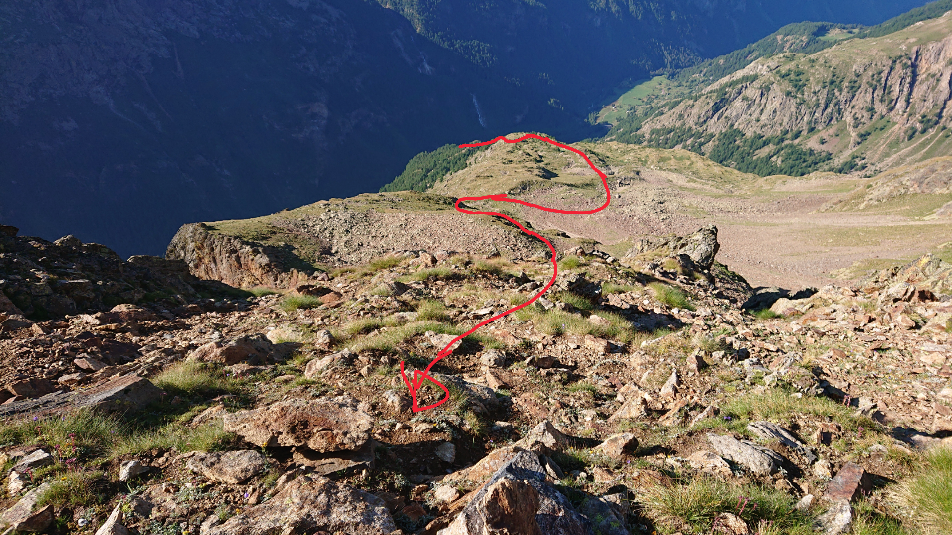 Da Chamen risalire la poderale e seguirla fino poco prima del Grand Chamen (2018 m, dove a dx a un bivio parte un sentiero segnavia n.3 (in giallo) direzione diga di Place Moulin. Seguirlo in lieve discesa. Si giunge a un pulpito costeggiando alla base l’intera bastionata che sorregge i pascoli superiori a sud della nostra meta, fino ad un successivo bivio contraddistinto da ometto con paletto in legno. Si lasca il sentiero che prosegue per la diga sulla dx a favore del sentiero meno evidente all’istante sulla sx. Risalirlo a fatica cercando di non perdere la traccia, fino a giungere a dei ruderi di baite 2211m tra radi larici. Con un piccolo sentiero che va ormai scomparendo, si attraversano in direzione nord.est i vasti pascoli alla base della Becca che mutano poi in colate di detriti. Più sopra oltre una valletta si raggiungono gli altri ruderi dell’alpe Chatelè 2390 m. Portarsi in seguito alla base della cresta sud che muta più sopra in sud-sudest per colate di detriti e rade tracce di sentiero ad una quota di ca 2800m. Quota questa da dove si parte ad attaccare la cresta, e che si segue per un dislivello all’incirca di 400 m, per detriti e roccette fino in vetta ( ore 4-5 da Chamen). Discesa per stessa via, oppure in traversata per la cresta sud sud ovest lungo speroni e canalini con difficoltà decrescenti man mano che si guadagna cammin facendo in discesa la base della parete a forma di triangolo isoscele all’altezza dei pascoli, che vanno riattraversati verso sx fino a riprendere il sentierino dell’andata e chiudere cosi’ il periplo alto attorno alla montagna da sud. Il tempo a scendere questa variante di cresta , e’ pressochè analogo a quello necessario per ridiscendere dalla cresta medesima di salita.