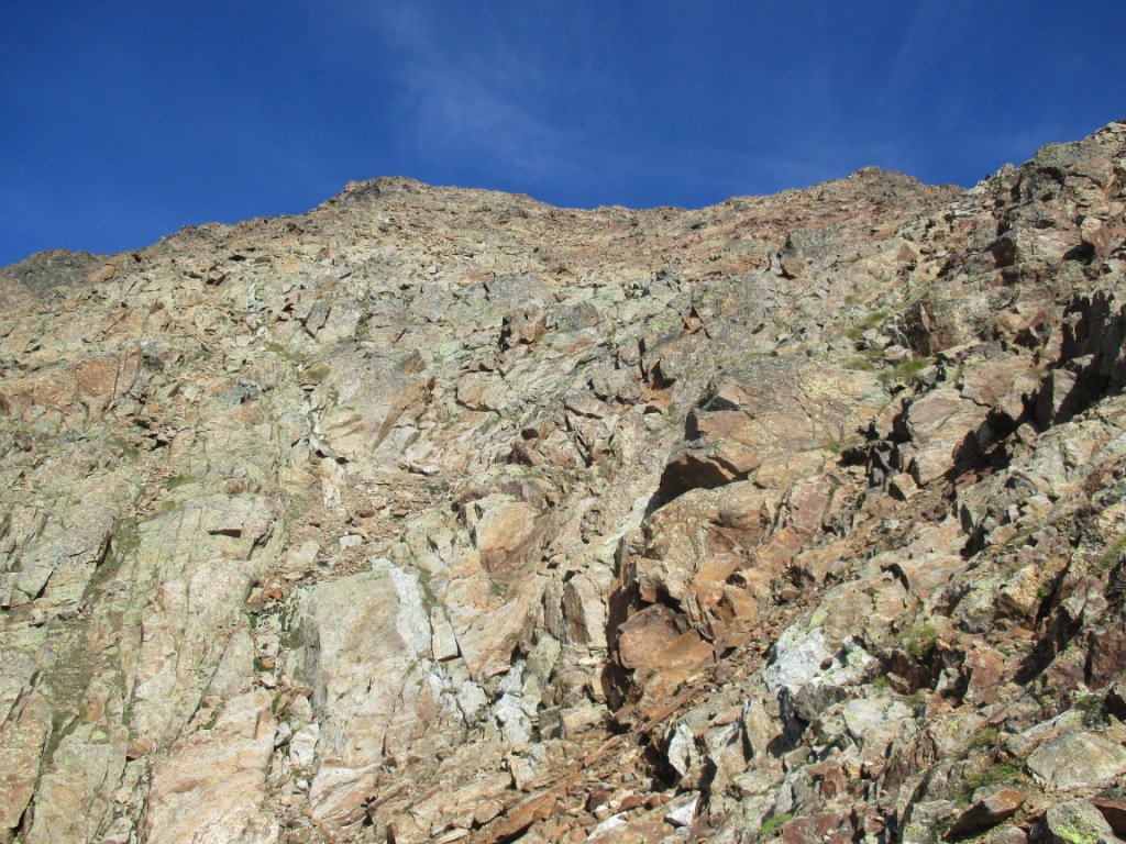 la discesa per la cresta SW e’ piu’ tecnica..anche qui passaggi di II°…alterna tratti di roccia ottima a sfasciume..ma la cosa alla quale occorre fare particolare attenzione e’ sopratutto intercettare il percorso corretto, in quanto, al contrario della cresta di salita, che e’ unica e comprensibile, quella di discesa e’ un insieme di canalini che si diramano.