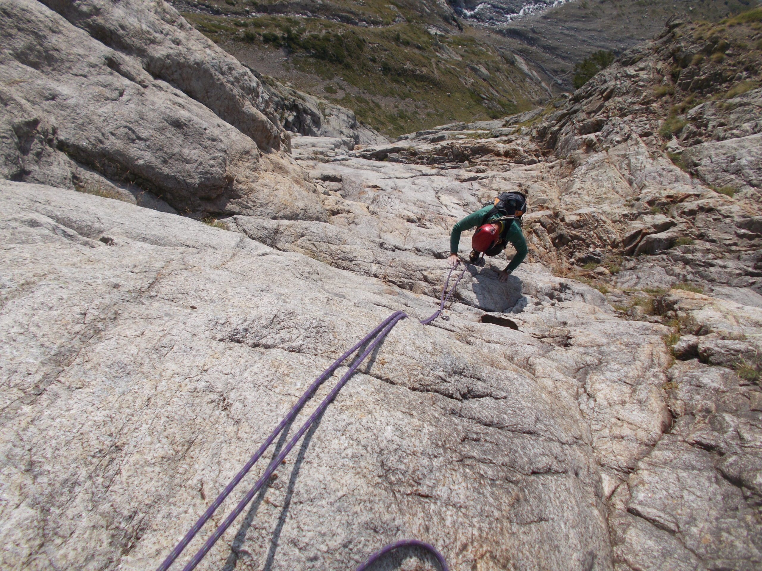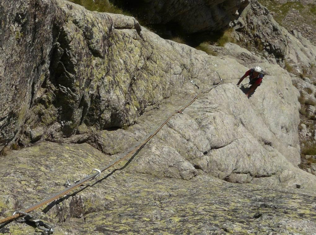 - L6: traversare a sinistra, superare uno spigolo ed entrare nel canale a sinistra, Continuare in traverso senza alzarsi (30m, II, III+, 5spit)