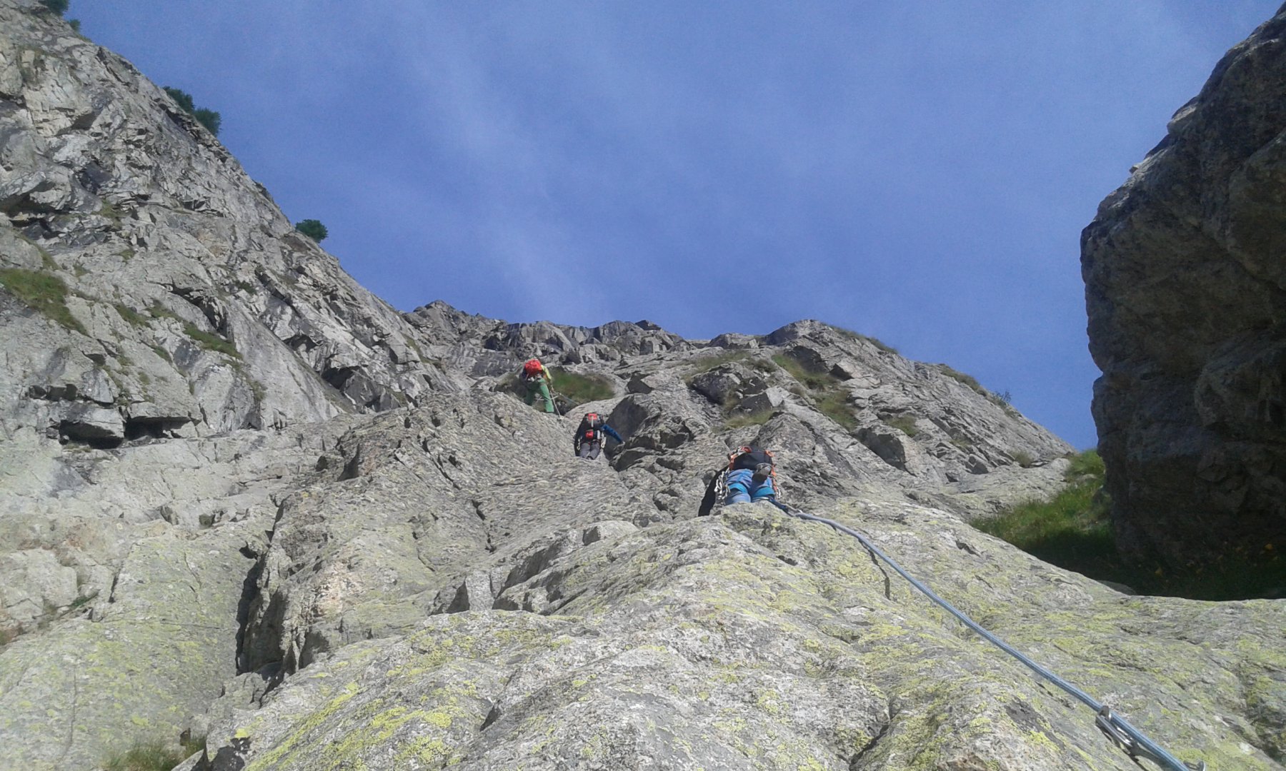 - L1: vago spigolo e per gradoni raggiungere la sosta (30m, IV+, 5spit)