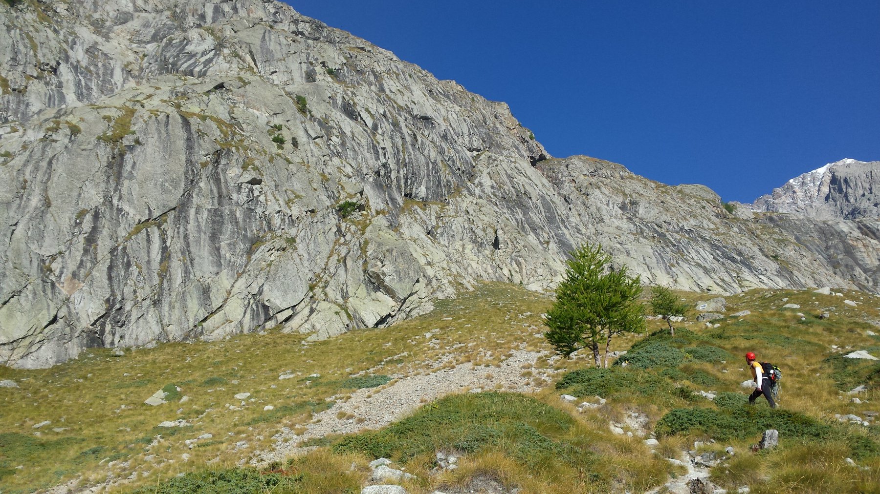 In obliquo per traccie di sentiero e seguendo i bolli si raggiunge la base della parete.
