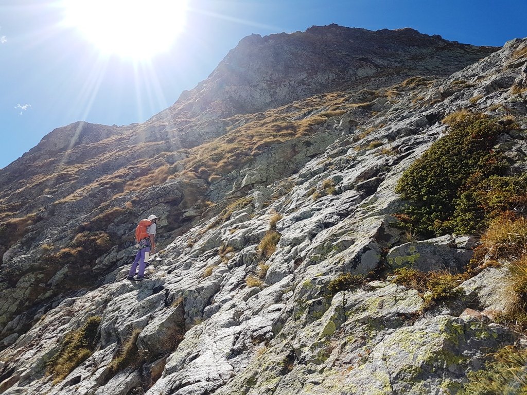 - L2: continuare per gradoni fino ad entrare in un corto diedro da cui si esce a sinistra (30m, III, IV, 6spit)